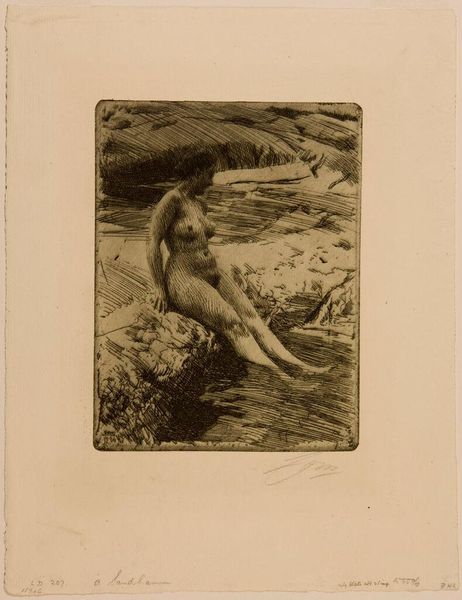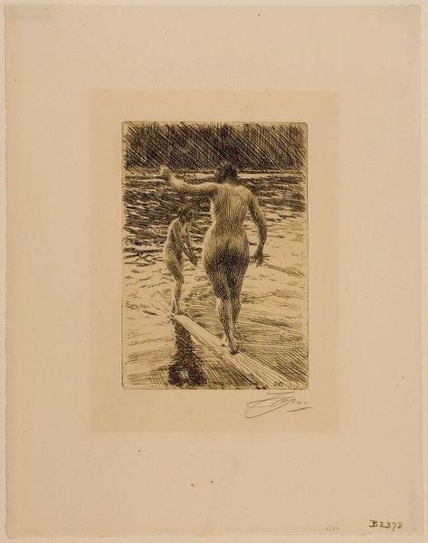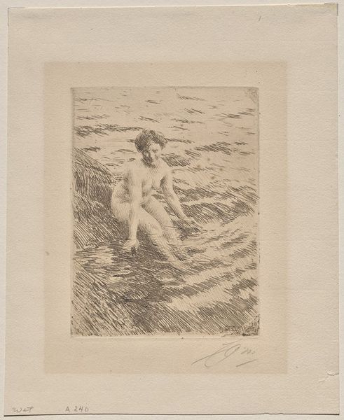 Curator: Anders Zorn's etching, "Dalarö," presents a figure wading into water. The print, measuring about 15 by 12 centimeters, showcases incredible detail. Editor: It’s captivating! The limited palette creates a sense of intimacy, like glimpsing a private moment. The materiality of the paper contrasts with the fluidity of the water depicted. Curator: Zorn was celebrated for his ability to capture light and movement using the etching process. The social context of bathing in the late 19th century reflected changing attitudes toward the body and leisure. Editor: Absolutely. Consider the tools Zorn employed, the acids used to bite into the metal plate. He was part of a broader craft tradition, transforming base materials into something of beauty and value. Curator: The print would have been sold through galleries and print shops, contributing to Zorn's commercial success and reinforcing the value of reproductive media in disseminating art. Editor: So, it's not just about the image itself, but also about its life as a commodity, about distribution, consumption, and the artist's evolving labor and engagement with market forces. Curator: Seeing the layers of cultural and economic meaning enriches my appreciation of Zorn's skill. Editor: And examining its production deepens our understanding of artistic value.