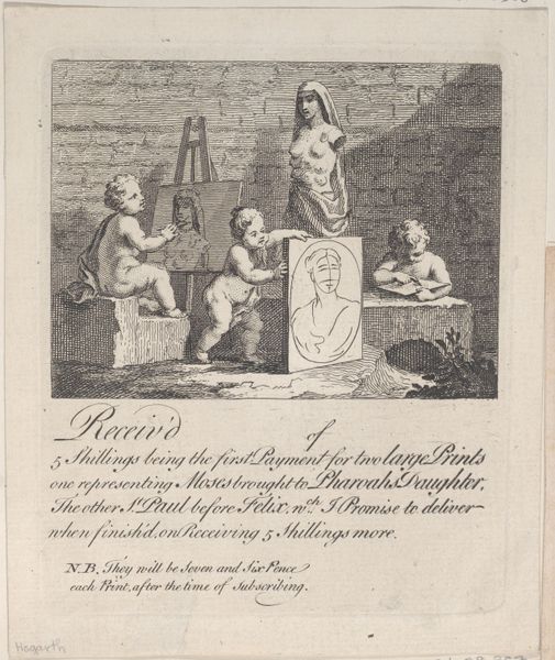 Curator: Examining "Boys Peeping at Nature" by William Hogarth, created sometime between 1737 and 1800 using etching, engraving, and drawing techniques, strikes me with its complex, almost satirical composition. What grabs your attention initially? Editor: For me, it's the contrast! The playful cherubs juxtaposed against the classical statue—it feels irreverent, even a bit cheeky. What are your thoughts on the organization of the figures and how they play within the image space? Curator: Intriguing observation. Consider how the cherubs actively engage with art itself – one sketches, another playfully interacts with the statue, while a third appears absorbed in study. Hogarth orchestrates them to create a visually stimulating experience; observe the rhythmic alternation of light and shadow across each form, from the rounded softness of the cherubs to the starkness of the statue. Do you detect a central point or balance that draws your eye through it? Editor: Perhaps the statue and its gaze that creates that visual anchor. Are you suggesting he's deliberately questioning the role of classical art through the use of contrast in forms? Curator: Indeed! Notice how Hogarth positions them; the cherubs, lively and impulsive, stand in contrast to the statue's stoic idealism. Their presence mocks it almost. Through carefully balanced arrangement, he sets a challenge—classical forms of ideal beauty can be interpreted through raw expression of life. This is a dialogue in pictorial form, conducted with light, form, and the precise strokes of the engraving. Editor: I see, almost like he’s trying to bring high art "down to earth" and maybe playfully mock the stuffy classical ideals? It makes the piece feel very alive. I appreciate that insight into what Hogarth might have been saying about art's accessibility.