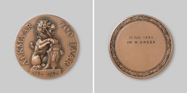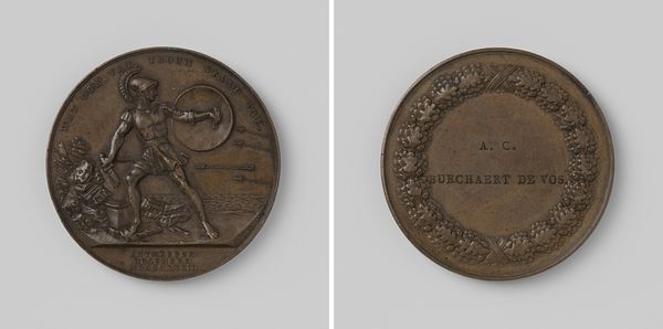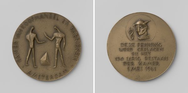 Curator: Here we have a relief sculpture dating from 1922. The piece, made of metal, is entitled "Beloningspenning van de verzekeringsmaatschappij De Oude Zwolsche van 1895 te 's-Gravenhage," and it comes to us from the hand of Eduard Hüttl. Editor: My first impression is one of rather somber stateliness. The relief is executed with incredible precision, giving these horses a sense of formal elegance, though in such a small size. Curator: Yes, the formality is quite pronounced. Observe how the artist uses the limited depth to suggest volume and musculature. The interplay of positive and negative space creates a compelling sense of depth and motion despite its actual stillness. The composition directs the viewer's eye from the rearing horses towards the horizon. Editor: Looking closely, you begin to understand that the surface has a smooth, almost tactile quality, enhanced by the play of light. Consider how metal was crafted and refined by skilled laborers—artisans executing precise molds. This elevates metal from common commodity to a cherished emblem within a corporate narrative. It evokes questions about class, labor conditions, and societal values embedded in material objects. Curator: Certainly, the choice of metal contributes to the object's symbolism. Its durability speaks to enduring value, reflective perhaps, of the values of this insurance company. We could read the figuration of the horses as representing themes of strength, reliability, and partnership, which is underscored on the reverse with engraved, bureaucratic language that seems almost at odds with such idyllic figuration. Editor: Exactly. The transition in textures—the smoothness of the coin, and the raised areas that form the horses—implies stages of production. From a fluid substance shaped by human intervention to create something not only lasting but with a complex social function. It's also worth examining how a coin-like item—generally mass-produced—adopts artistic significance, prompting thoughts about hierarchies within craftsmanship and art. Curator: Very insightful. This melding of classical figuration with corporate symbolism and historical context invites one to contemplate art’s relationship with society and industry in the early 20th century. Editor: Indeed, such objects highlight hidden layers of intent and purpose intertwined with an artifact designed with utilitarian motives, bringing historical production into discussions on value within cultural works.