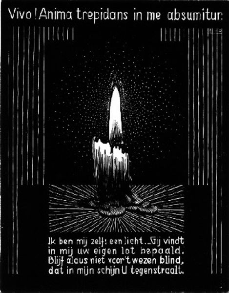 Editor: This is M.C. Escher's "Emblemata - Signpost," created in 1931. It's a print, primarily in black and white, with a very strong linear quality. There’s a striking, almost stark mood to the piece. What do you see in it? Curator: Well, immediately, I see a convergence of paths. The central image, the signpost itself, is inherently symbolic of choice, direction. Notice the Latin phrase above, "Omnes praeter unam praeclusae," which translates to "All but one are closed." This suggests a deliberate limitation of options, perhaps even a sense of predetermination. Does that resonate with you at all? Editor: It does. I also see that radiating pattern beneath the signpost—like stars or dust, maybe representing potential routes. Curator: Precisely. And that connects us to a deeper, perhaps psychological, reading. Escher frequently grappled with ideas of infinity and limitation. This piece suggests that perceived freedom of choice might be an illusion. Consider, also, the textual element below. What's its message? Editor: It's in Dutch, but it seems to be about cautiously or carelessly taking a free road, suggesting only one choice matters because every other road will be blocked. That's very existential. Curator: Yes, Escher is pointing to how deeply the symbols connect to one another in our decision making. Editor: I’d been so focused on the image, I almost missed the deeper symbolic meaning behind it. Thank you! Curator: It’s in exploring the links between images and text that we understand how the images linger in our collective imagination.