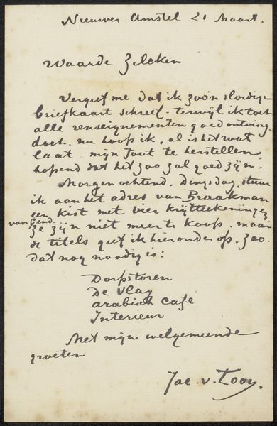 Editor: Here we have Jac van Looij’s "Brief aan Jan Veth," likely from 1906, done with pen and ink on paper. It gives me a very intimate impression, like peering into a private correspondence. What do you see in this piece? Curator: This letter offers a glimpse into the artistic and intellectual circles of the early 20th century. The calligraphy itself is telling. In a time of great political change in the Netherlands, from rising socialism to the women’s movement, we see these themes reflected even in personal correspondence between artists, like whispers within broader societal shifts. Does the informal tone give you a sense of familiarity, perhaps even a challenge to the established norms of communication at the time? Editor: Yes, definitely! The handwriting feels very personal, and yet I'm sure it would have meaning for the receiver. I mean it has a different purpose from art that is hung in a gallery. Curator: Exactly. And who has access to these 'private' conversations? Were women also having this same dialogue? If not, why is that? These absences speak as powerfully as the presence of this script. Considering that van Looij writes to another artist makes me wonder how they both use this intimate sphere to discuss broader social justice concerns in their work. Editor: So you're saying that even something seemingly as simple as a letter between artists can be deeply connected to the social issues of the time. Curator: Precisely. It encourages us to question the narratives, to look for the untold stories within these beautifully crafted lines, and to explore their relevance in the fight for equality and justice today. Editor: That’s a great point. I never thought about how much a letter could tell us about society.