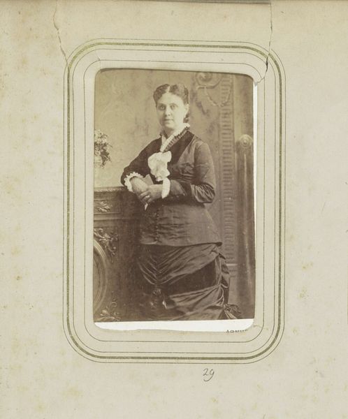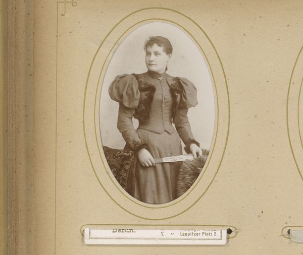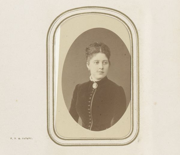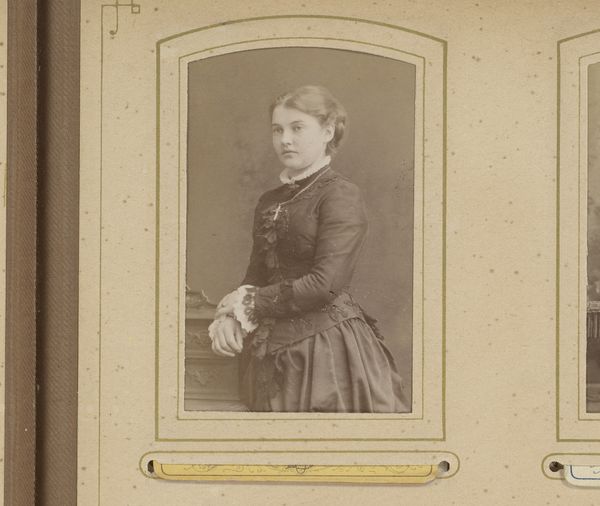Curator: This is a gelatin silver print from between 1865 and 1903, credited to De Lavieter & Co. It's titled "Portret van een staande jonge vrouw, leunend op een balustrade"—"Portrait of a standing young woman, leaning on a balustrade". Editor: She has such a sweet sadness in her eyes, doesn’t she? I'm instantly struck by the sepia tones lending a melancholic feel to this simple scene. Curator: Indeed. Note how the oval format emphasizes the woman’s contemplative gaze and elegant composure. The balustrade introduces a geometric rigor contrasting with the softness of her ruffled collar. It almost contains her. Editor: And the lace! That crisp, delicate froth at her neck seems so fragile, in sharp contrast with the sturdy stone she rests against. What’s she thinking, I wonder? Love lost, perhaps, or dreams deferred? You can sense her constrained within societal expectations. Curator: Quite. This gelatin silver printing process offered a broad tonal range—observe the minute variations giving texture to her dress and subtle fall of light across her face. Compositionally, her placement against the dark backdrop flattens the depth. The use of semiotics offers interesting insight into the societal restraints of her time. Editor: Constraints yes, but she carries herself with such a poised strength, doesn't she? There’s an inner spark resisting the formal confines around her. I get a strong feeling that despite the constraints of being captured in a formal portrait, there’s an irrepressible life wanting to burst free. She could probably be so full of fun and fire! Curator: An intriguing point. Perhaps the apparent austerity merely heightens those very possibilities… it opens the photograph up to more varied analyses. Editor: Absolutely. All the same, this young woman peering across time makes me reflect upon how much, and how very little, things change across generations. Curator: Precisely. These layered contexts allow for a fascinating dialogue to emerge.