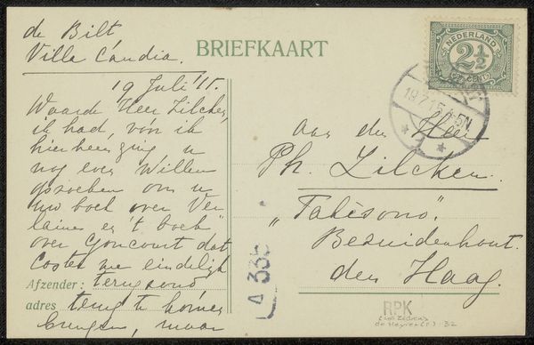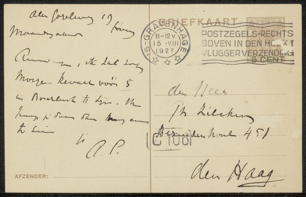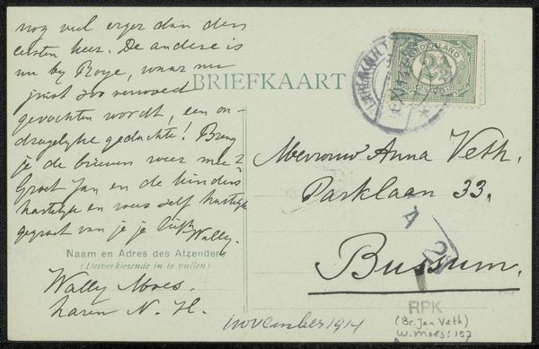 This postcard was written by Albert Verwey to Philip Zilcken, and it’s kind of like a little drawing in its own right. Look at the pressure he puts on the pen; the ink swells and pools at the start of each word, creating these lovely dark accents. It makes me think about the rhythm of writing, the way your hand moves across the page, pressing and releasing. I love how the handwriting leans and curls, like a plant reaching for the sun. It's so fluid and personal, almost like a signature in itself. See how Verwey's words fill the space, bumping up against the edges of the card, creating this intimate, almost claustrophobic feeling? It reminds me of Cy Twombly’s scribbled paintings or some of Basquiat's word-based works. Art, like a letter, is always a conversation, a way of reaching out, of connecting with someone else through marks and gestures. Each word, each stroke, holds a little piece of the artist's heart.