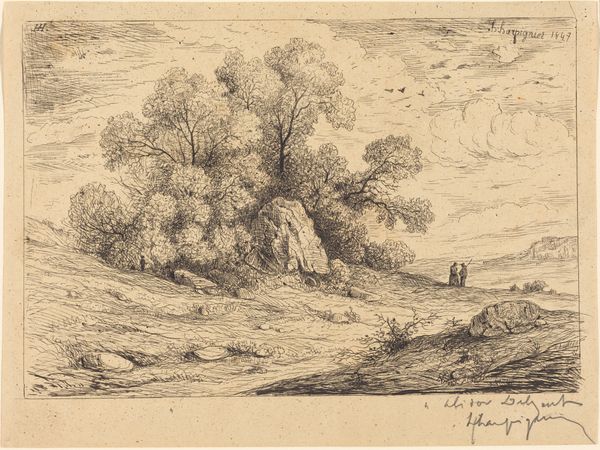 Editor: Here we have "House Among the Trees in the Countryside," a pencil drawing by Maria Vos, created around 1863-1864. There’s a stillness, almost a hushed quality to the scene that I find quite compelling. What do you see in this piece, particularly regarding its historical context? Curator: What strikes me is how this seemingly tranquil landscape interacts with notions of land ownership and social structures of 19th-century Netherlands. Consider the lives lived within that rustic house. The "romantic" depiction of rural life often obscures the harsh realities of agrarian labor and class divisions. This idealized view, though beautifully rendered by Vos, serves a particular narrative – one that may gloss over social inequalities inherent in rural society at that time. Does the artist challenge or reinforce this romantic perspective? Editor: That's a thought-provoking question! It makes me wonder if Vos intended to comment on these issues or if she was simply capturing the aesthetic beauty of the countryside. Is it possible for a landscape to be inherently political? Curator: Absolutely. Land, and its depiction, has always been a contested space. Whose stories are being told, and whose are being left out? Vos, as a female artist navigating a male-dominated art world, adds another layer to this. Were women afforded the same access to the artistic circles? How did gender shape her experiences and artistic choices when depicting landscapes? Her choices of subject, composition, the very act of creation becomes an act of representation that deserves interrogation. What is she choosing to reveal or conceal? Editor: So by looking at "House Among the Trees," we're not just appreciating a pretty picture but also engaging with complex social issues related to land, labor, and even gender in the 19th century? Curator: Precisely. By viewing it through a lens of social awareness, we unearth deeper meaning and see the artwork not as an isolated object, but as a historical artifact embedded in its time. It gives us room to understand power structures inherent in its own time. Editor: That’s really opened my eyes. I’ll definitely look at landscapes differently now. Curator: Wonderful! Art holds such potential once you begin unraveling these historical ties.