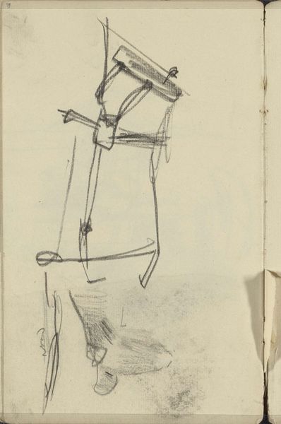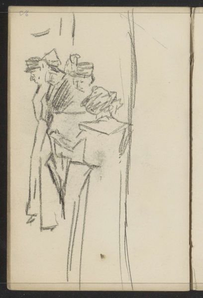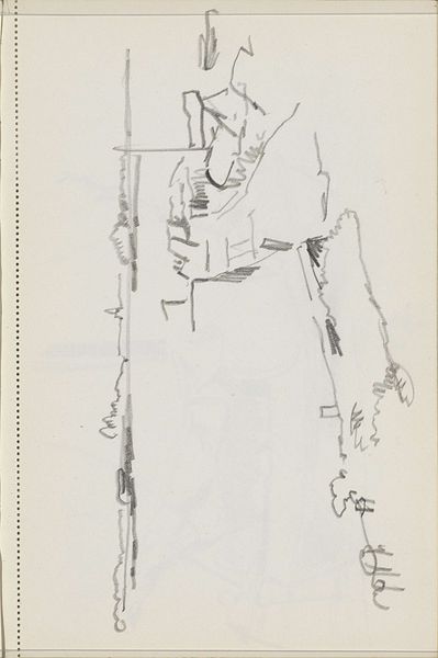 Curator: What a wonderfully understated drawing, this "Figuur op een aangemeerde boot, mogelijk in de Prinseneilandsgracht" by George Hendrik Breitner. It’s likely from around 1907-1911. Editor: Immediately, the composition strikes me. The sketch is sparse, almost fragile. The stark use of graphite and charcoal emphasizes the industrial aspect of the scene. Curator: Breitner, deeply involved with documenting Amsterdam, was keenly aware of urban life. This drawing provides insight into the working class that inhabited those spaces. Think about how industrialisation impacted labour in early 20th-century Netherlands, focusing specifically on canals, the docks and people whose jobs and existence revolved around such landscape. Editor: Indeed, the rough textures and linear style suggest rapid execution, mirroring the hectic pace of work around the canals. There is no romanticism here, just a recording of labor and what materials facilitate its execution in terms of access between places via the Prinseneilandsgracht canal. Curator: I'd like to draw our attention back to the figure itself. How would you interpret their stance, posture, perhaps even social class, based on how Breitner depicted them? And what are the racial politics related to these portrayals? Editor: It's hard to make firm judgments without much detail, but there’s a weary resignation suggested in that stooped figure. I suspect an artist like Breitner must have seen labour in such urban zones not only in terms of social status but also how materials shaped how workers, whether on the canals or land, experienced Amsterdam during industrial transformations. Curator: So we're both left contemplating the complex relationship between labor, urban transformation, and individual experience, captured by Breitner's efficient application of graphite and charcoal. Editor: A preliminary, quickly realized work—drawing in graphite and charcoal—is often as revelatory as a finished oil painting because the bare bones of art's making and artists´ way of living through material necessity remain in front of us.