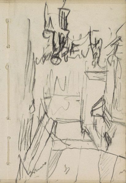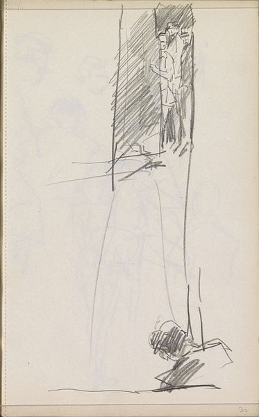Editor: Here we have George Hendrik Breitner’s "Figuur in een landschap en een staande vrouw," created around 1880-1882, using graphite and pencil on paper. It feels incredibly raw and immediate, like a fleeting moment captured. What do you see in this piece? Curator: I see a compelling intersection of societal observation and artistic process. Breitner, deeply engaged with the working class of Amsterdam, often depicted them anonymously, stripped of individual identity. Is this faceless figure, rendered with such hasty lines, representative of the marginalized, rendered invisible by societal indifference? Consider, too, the way the landscape seems to encroach, almost pressing down on the figure. Do you see this as a reflection on the limited opportunities afforded to women, perhaps? Editor: I hadn't considered the landscape's pressure, but now I do. The dark mass at the bottom really weighs down the composition. Is the sketchiness indicative of his style? Curator: Precisely. His 'sketchy' style—though actually very deliberate—mirrors the ephemeral nature of urban life for the lower classes. Breitner used photography extensively to capture reality, which influenced his rapid sketching technique. One must ask: can we read his quick strokes as an assertion that reality itself is fleeting, perpetually on the verge of vanishing? Editor: It’s like he's documenting something before it disappears. What can we make of the 'staande vrouw' - the standing woman? Curator: I wonder if we can interpret her stance as representing resistance or a call to recognize their precarious place in society. Also note, the contrast between her and the ‘Figuur in een landschap’; is it also about drawing parallels or highlighting differences of that experience through composition, positioning? These drawings seem not only observational but like deliberate tools for advocacy through observation. Editor: So by analyzing the social context, even a sketch like this offers a rich tapestry of interpretation! Curator: Absolutely. Understanding art as a historical and social product lets us have these meaningful conversations. I appreciate how open you've been in interrogating these sketches' wider narrative.