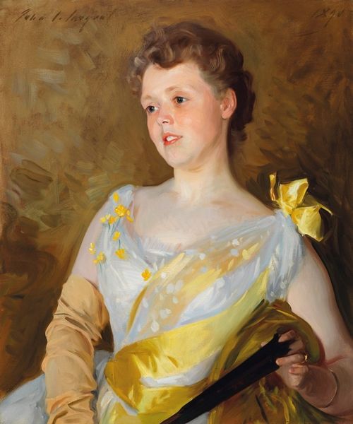 Editor: This is John Singer Sargent's "Katharine Pratt," painted around 1890. The subject's almost ethereal in her white dress, yet her gaze seems troubled. The blurry landscape in the background feels a bit ominous. What do you see in this piece? Curator: Oh, Sargent. He always catches my breath. Notice how he plays with light on the dress, a cascade of white on white. There’s a push and pull here: the confidence of the brushstrokes versus the sitter’s almost vulnerable pose. And that backdrop— it's more a mood than a place, isn't it? A painted poem more than a record, I think. What story do *you* think she's carrying with her? Editor: I'd guess she’s constrained somehow. Her pose is almost defensive, with her hands placed so deliberately. The darkness surrounding her head seems to close in on her. Curator: Exactly! There’s a narrative being hinted at. Was it a society portrait commission, maybe, where she had to fulfill certain expectations while harboring other dreams? It's the silent space around her that shouts the loudest, don't you think? I feel for her... or perhaps the part of me in every sitter, waiting to be truly seen. Editor: That makes so much sense! I hadn't thought of it as a push and pull between her true self and what's expected of her. It feels much more poignant now. Curator: Yes, portraits can be mirrors and masks, especially when Sargent’s wielding the brush. Art opens these little windows to the souls we think we see captured on canvas, right? A conversation with someone across time... and perhaps ourselves, too. Editor: Absolutely! Thank you for pointing out all those nuances. I’m seeing a whole new dimension now!