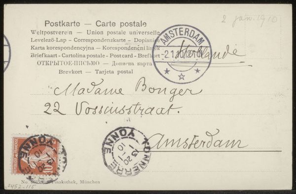 Curator: This is "Briefkaart aan Pieter Haverkorn van Rijsewijk," possibly from 1907, created by F. Ritter using ink on paper. Editor: The stark, graphic quality of this postcard evokes the immediacy of fleeting interactions. I'm drawn to its subdued palette, creating a snapshot of everyday communication at the turn of the century. Curator: Indeed. It’s a simple, functional object, yet the careful application of ink gives it a unique, handcrafted feel. Note the precise strokes that shape the architectural lettering—a stark contrast to today’s digital fonts. Editor: But who was Pieter Haverkorn van Rijsewijk, and what does this document reveal about the cultural landscape of its time? Addressed to the Director of Museum Boijmans, this postcard represents a form of administrative or perhaps personal communication deeply entwined with institutional power structures of the early 20th century. Curator: Interesting observation. Structurally, the card’s division—the formal printed address versus the handwritten inscription— creates a visual and textual dialogue that underscores a tension between public and private spheres, formal protocols versus informal exchanges. The stamp, in and of itself, is like a mini-narrative. Editor: Exactly. A red German stamp dated "24 1.07 10-11," anchors it geographically and historically. A message that transcends physical presence; an act freighted by potential encounters and the possibility of connection between different historical moments. Who were these senders, and what urgencies were behind this need to get their message across quickly? Curator: Consider the compositional weight given to typography itself, almost abstracted in its presentation. We can almost appreciate it outside the context of legibility. Editor: You are looking closely, because it has resonance now too—especially as communication tools change so rapidly. It’s a reminder of both how communication once happened, and also that, sometimes, the messages we receive and send barely survive—the faintest marks across time. Curator: Precisely. It urges a re-examination of routine, of its textures and materials, which reveals how such objects echo even after many years. Editor: Very well observed, and a thoughtful summary.