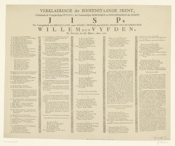 Curator: This intriguing print is entitled "Vreugdecourant bij 25-jarig regeringsjubileum van Willem V, 1791," marking William V's 25th jubilee. It's attributed to J. Peppelenbos. Editor: At first glance, I see a curious mix of textual density and ornate visual elements, something celebratory, yet strangely rigid. The eye doesn't know where to land! Curator: Well, that's quite typical. This engraving, probably produced sometime between 1791 and 1798, utilizes calligraphy and baroque ornamentation alongside dense text to celebrate and commemorate. Note the inclusion of portraiture amidst a style recalling the Dutch Golden Age. It’s essentially a decorated news bulletin. Editor: Yes, those vases flanking the text… loaded with symbolic weight, I presume? Are those stylized orange trees meant to reference the House of Orange? The use of ornament makes me think it functions almost like a commemorative plate produced en masse, with its implicit appeal to wide participation and even consumption. Curator: Absolutely. The orange tree is a clear visual metaphor, and those classically styled vases are no accident either. Beyond simple decoration, these are culturally loaded visual tools, emphasizing the Prince's authority by association with grandeur, prosperity, and the Golden Age's visual cues. This form serves to sanctify the image of the Stadtholder in order to affirm the strength of Dutch identity as the political landscape changed, the people still wished to see Willem as their champion. Editor: I agree, and it points to an interesting intersection of propaganda and popular culture. This wasn’t just about information dissemination; it was about actively shaping perception through readily reproducible images and textual appeals. It asks us to consider the networks of production, consumption, and meaning-making inherent in these kinds of commemorative items. Curator: Indeed, an object produced to consolidate power via symbols now invites our contemplation on its societal role. Editor: So a print celebrating Willem becomes, through time, a historical object inviting inquiry.
