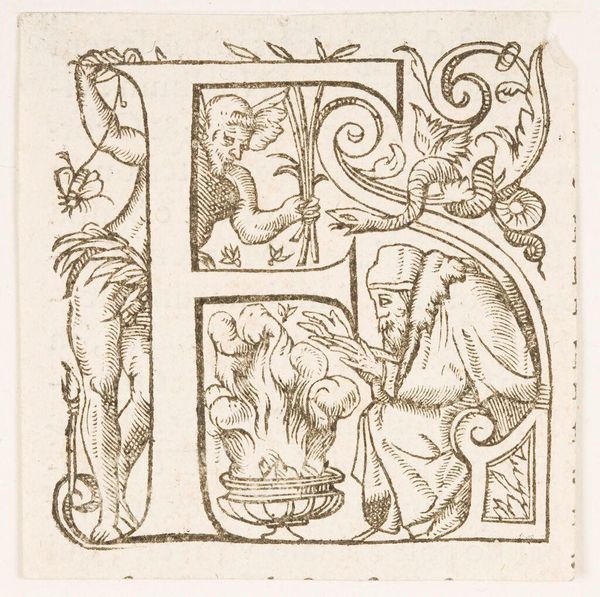Curator: Here we have "Letter O," an anonymous print from the collection of the Harvard Art Museums. Editor: What strikes me immediately is the intense energy in this small space. There is a powerful dynamic between the two figures. Curator: Indeed. The composition is striking. The artist uses the form of the letter itself to frame a scene of two figures, one carrying the other on his back. The stark black-and-white contrast creates a bold visual statement. Editor: I see it as an allegory for burden and support—one figure appears to be almost collapsing under the weight of the other, while the carrier's expression is almost... gleeful? Perhaps it’s about the unequal distribution of labor or responsibility. Curator: Interesting. Or could it be an exploration of pure form, the interplay of line and shape creating depth and tension? Editor: I appreciate how the symbols transcend time. It's fascinating to see how such visual ideas continue to resonate. Curator: Ultimately, "Letter O" presents a puzzle of form and interpretation, a testament to the power of simple visual language.