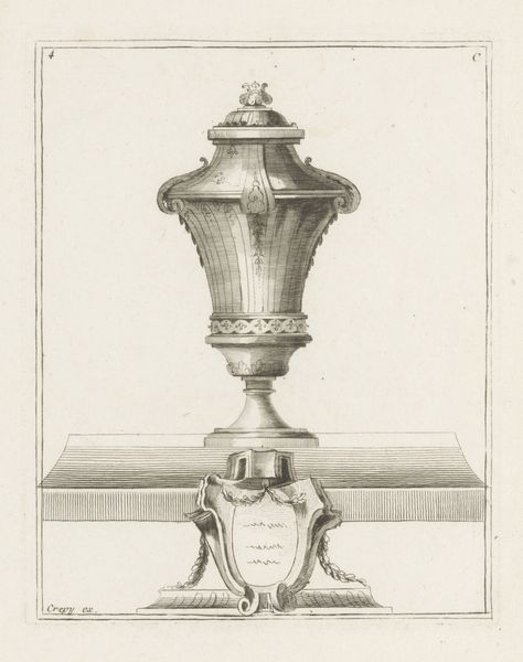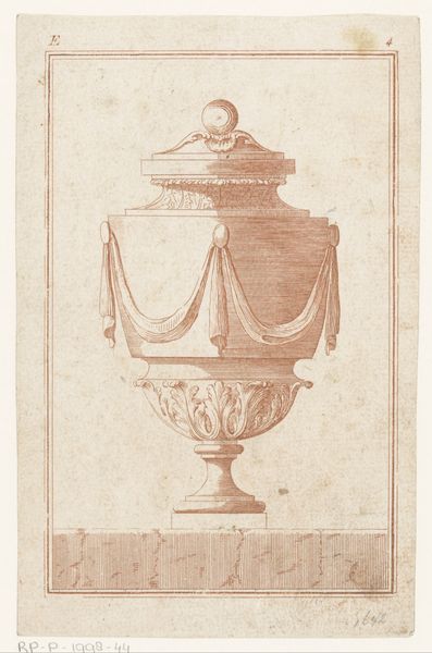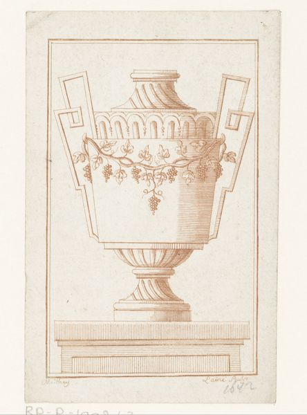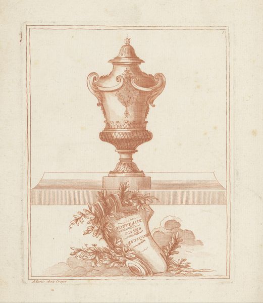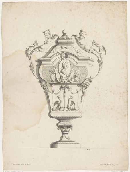 Editor: This is "Vaas met medaillonportretten," a drawing and engraving by P. (l'ainé) Moithey, dating from between 1760 and 1780. It feels very architectural, almost like a blueprint. How would you interpret this work? Curator: Considering this piece through a historical lens, its Neoclassical style points to a resurgence of interest in classical Greek and Roman aesthetics. How do you think this drawing functions within that revival? Was it meant to simply decorate, or did it have a different purpose within the 18th-century art world? Editor: I see what you mean. Maybe it was meant to showcase the ideal forms and proportions from antiquity? I hadn't really thought about it that way. Curator: Exactly. Think about the decorative arts during this time; they played a significant role in conveying social status and intellectual sophistication. What social class would be most likely to value or commission such work? Editor: I would guess the aristocracy or upper middle class, given the level of refinement. Was it also meant to spread new ideals of beauty and good taste? Curator: That’s insightful. Consider how engravings like this circulated widely, influencing taste and design far beyond the elite circles. Could this print be seen as an instrument of cultural power, shaping aesthetic values on a broader social scale? Editor: That's a fascinating idea. So, it’s not just a pretty vase drawing; it's part of a larger cultural conversation about class and influence. I didn’t realize it had such a complex background. Curator: Indeed. It shows how a seemingly simple design reflects deeper socio-political dynamics, and even now the very act of displaying and contextualizing this artwork contributes to an ongoing dialogue. Editor: I learned to look beyond just the visual and to examine an artwork's historical context. Thanks! Curator: It’s essential to recognize how museums play an active part in this continuous cultural narrative and meaning-making.
