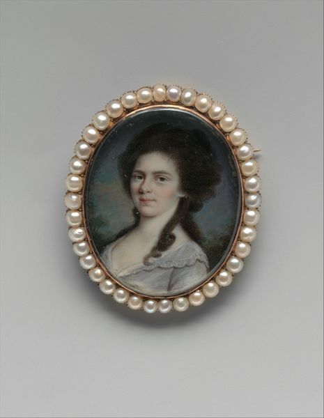 Charles Willson Peale's miniature portrait of Mrs. Charles Willson Peale, or Rachel Brewer, presents a delicate rendering of his wife, encapsulated within an ornate oval frame. The composition, dominated by soft pastels, focuses on the sitter's face, framed by her elaborate hairstyle. Peale's technique emphasizes subtle gradations of light and shadow to model Mrs. Peale’s features, evoking a sense of intimacy and warmth. The limited palette enhances the formal structure, drawing attention to the balance of color and the interplay between the figure and the background. We might consider this work as an exploration into the semiotics of portraiture, where elements such as hairstyle and dress code signify social status and personal identity. Ultimately, the painting’s refined aesthetic and diminutive scale invite a close, contemplative viewing, asking us to reflect on the artist’s formal skill and his conceptual understanding of portraiture as a signifier of personal and social identity. This encoding of values and relationships within the visual structure of the work highlights the complex interplay between art, culture, and individual expression.