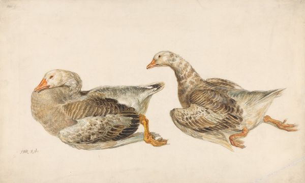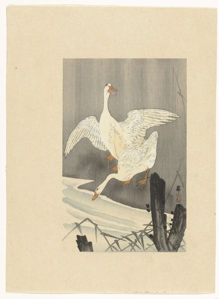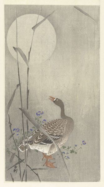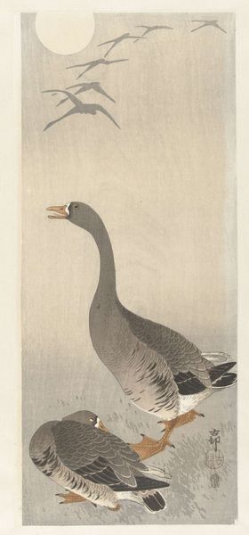 Curator: I find the muted tones incredibly calming; there's something about the overall wash that speaks to introspection. Editor: Yes, it is rather serene. We’re looking at "Two Geese," a print made by Ohara Koson sometime between 1900 and 1930, here in the Rijksmuseum's collection. Koson was a master of *kachō-e*, images of birds and flowers, popular in the Ukiyo-e tradition. Curator: It feels like I've stumbled upon a moment of quiet contemplation, like a secret world between two graceful birds, almost voyeuristic, isn't it? Editor: Perhaps. Ukiyo-e prints often captured fleeting moments, but with an eye for symbolic meaning. Waterbirds like these were often associated with marital fidelity, but also represented freedom. There’s a delicate balance between these interpretations. Curator: I see that, the dance of domesticity and freedom reflected. Also, have you ever considered how the very lack of a detailed background actually intensifies the feeling of floating, almost as though existence is beyond physical presence, somewhere above reality, in an ethereal place? Editor: The empty space, or *ma*, is a key element in Japanese art, allowing the viewer's imagination to fill the scene. It amplifies the presence of the subjects while suggesting infinite possibilities. It’s the quiet that speaks volumes, if you will. Curator: Precisely! That blankness also makes me ponder the fragility of nature. It seems to urge the thought that even something so delicate may be significant in this world. It's like looking into the face of the wild. Editor: The beauty of these works, perhaps, lies in the fact that it welcomes multiple understandings, inviting contemplation of both the personal and the symbolic, while it’s aesthetically minimal, right? Curator: Exactly. Thank you, it certainly made me think and also feel, a lot! Editor: And thank you, your sensitivity offers us another perspective!