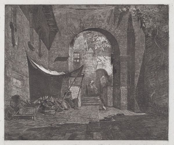Curator: Just look at that charcoal rendering. It's a dark vision! The way the artist layers the shading, it’s almost suffocating. Editor: Indeed. Let’s dive into what we’re seeing. This is “Tomb with Death Standing,” an etching with charcoal and engraving by Louis-Jean Desprez, made between 1779 and 1784. It's currently held at The Art Institute of Chicago. Curator: Death certainly looms large. You’ve got these massive architectural forms, what seem to be pyramids flanking either side of Death, all under that dark sky. It evokes a feeling of oppression. Were these images meant for public consumption? Editor: Absolutely. Desprez created these images, partly for the public's increasing appetite for Neoclassical design. But he also aimed at elite architectural circles, with aspirations of seeing his designs realized on a monumental scale, thus making his mark. It shows how the ambitions of artists intersect with larger socio-economic systems of patronage and architectural commissions. Curator: The materials tell us quite a bit as well, I imagine. Etching provided reproducibility and dissemination across architectural spheres, even internationally. This speaks to the labor and commercial potential embedded within what may seem like merely a study. Editor: You’re spot on! Beyond the overt theme of death, the material choices emphasize Desprez's engagement with labor and production to further his position in French society. It begs questions about his aspirations, and, frankly, how art acts as an agent within socio-economic currents of 18th century Europe. Curator: Seeing it this way opens new questions for me, as I often only see the politics of patronage. This print complicates those traditional structures by offering an analysis beyond the usual frameworks and into the realm of consumption, artistic intent, and market forces. Editor: Precisely. Understanding this blend is essential for truly grasping the significance of a work like "Tomb with Death Standing." Hopefully we helped our listeners see that as well.