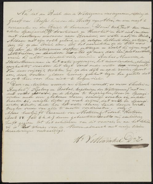 This is a letter, handwritten in Dutch in 1815 by Cornelis van Hardenbergh to Adriaan van der Willigen. It offers insight into the social networks and cultural values of the Dutch art world at the time. In this personal correspondence between two men, one can glean insights into the cultural capital associated with artistic patronage. The letter’s existence speaks to the significance of maintaining relationships within artistic circles, where status and reputation were crucial for professional success. The act of writing itself underscores the importance of communication and connection in the art world of the early 19th century. We can see that Van Hardenbergh uses the letter to solidify his bond with Van der Willigen, thereby enhancing his standing within their shared social sphere. The formal tone reflects the decorum and social expectations of the era. The letter gives us intimate insight into the way individuals navigate the art world. It highlights the blend of personal connection and professional ambition that characterized artistic communities.