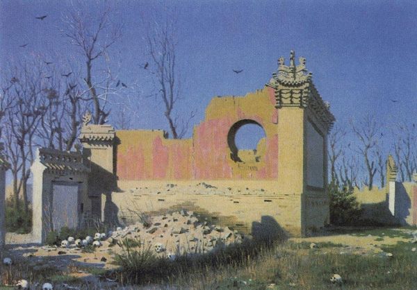 Editor: We’re looking at Vasily Vereshchagin's oil painting, "Ruins of Chinese Sanctuary," created around 1870. There's such a strong sense of stillness, almost a melancholy, with these figures amidst the rubble. What draws your attention when you look at this piece? Curator: Well, immediately I'm drawn to the implications of "ruins" here. Vereshchagin, a Russian painter, depicts the wreckage of a Chinese sanctuary. This isn't simply a landscape; it's a powerful statement on cultural disruption and perhaps even colonial impact, wouldn't you agree? We have to ask ourselves: whose perspective are we seeing these ruins from? And what power dynamics are at play? Editor: That's a perspective I hadn’t fully considered. The Western gaze imposing itself on the East...The serenity I saw initially seems more like a forced acceptance of destruction. Curator: Precisely. Think about the artist's choices: the realism in the ruined structures, the seeming indifference of the figures. What narratives are absent? Who isn’t represented here? This silence becomes a space for us to interrogate historical injustices, linking it to ongoing global issues of cultural preservation and the ethics of representation. Editor: So, rather than a picturesque scene, it's a commentary on loss and a prompt to examine the context and the artist’s positionality? Curator: Absolutely. And more broadly, doesn't it force us to question how we, as viewers, participate in the ongoing construction of history and meaning, especially across cultural boundaries? Editor: That's a shift from aesthetic appreciation to critical engagement – I really appreciate that viewpoint. Thank you for enriching my reading of the work, especially with those insightful social layers. Curator: My pleasure. It’s about remembering art isn’t created in a vacuum; it echoes, and shapes, our world.