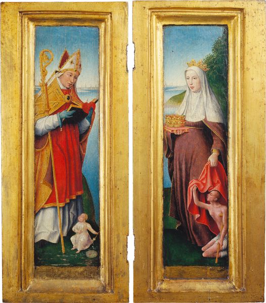 Editor: This is Álvaro Pires de Évora's "The Diptych of Annunciation," created around 1420 using tempera and gold. The gold leaf and the solemnity of the figures gives the piece an almost otherworldly feel. What stands out to you in this artwork? Curator: The power lies in the cultural narrative—the Annunciation carries centuries of weight. We see it here through potent visual symbols. Notice the dove, representing the Holy Spirit, contrasted with the scroll held by Gabriel. Editor: I see the dove, but what do you mean by "weight?" Curator: Consider the diptych form itself. Two panels, two distinct moments—promise and acceptance. The scroll unfurls, bearing the message, while Mary appears contemplative, her book perhaps alluding to prophecy fulfilled. Editor: It's like two sides of a conversation, presented together. So, these aren’t just aesthetic choices? Curator: Not at all. Color too—the gold backgrounds, for instance, evoke divine light, and the earthly garments connect the spiritual to human life. Do you find that balance creates a tension? Editor: I think it does, actually. There is tension between the gold leaf and then, just very grounded colors, like rose and olive green. Curator: Precisely. That contrast isn't just visually interesting, it reinforces the emotional and spiritual dichotomy at the heart of the Annunciation narrative: the intersection of the divine and the earthly. And isn’t it thought-provoking how these visual motifs continue to resonate even today? Editor: It really is! I never thought about how much cultural information is packed into such seemingly simple images. Thanks for sharing your perspective!