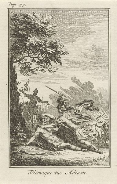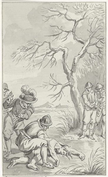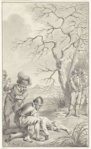 Editor: Here we have Jacobus Buys' ink drawing, *Veldslag met krijgsgevangenen*, likely created somewhere between 1734 and 1801. The monochromatic palette definitely conveys a somber mood. The chaos of battle, bodies strewn, rendered in such delicate strokes... it's quite striking. What's your interpretation? Curator: Striking indeed! For me, this isn't just a battle scene; it’s a meditation on the aftermath. See how Buys focuses not on heroic clashes, but the resigned faces of the captors and the vulnerable state of the prisoners. I almost feel as though I am witnessing history slowly decomposing. Don’t you get the impression that he seems preoccupied by history paintings? Editor: Yes, absolutely! And you can sense it in his Baroque sensibilities too, I think, but what strikes me as somewhat offbeat is this... almost detached realism. How do those different styles harmonize? Curator: Ah, the crux of it! It's in that tension. Buys takes the sweeping drama of the Baroque, but instead of glorifying war, he roots it in human experience. That bare tree on the left, for example – could it be a symbol of the barren consequences of conflict, do you think? It is so… expressive. Editor: That's a perspective shift I hadn't considered. Seeing the 'realism' as serving a larger purpose of undermining heroic idealizations… fascinating. It’s less about the clash, more about what comes after the clash. Curator: Exactly! The aftermath holds a mirror to humanity, revealing uncomfortable truths, don’t you think? And isn’t it amazing that such intricate thoughts could come from something as humble as ink on paper? It certainly gets one thinking about Baroque and Realism differently! Editor: It does. This makes me see beyond just style and more into the why. Thanks!