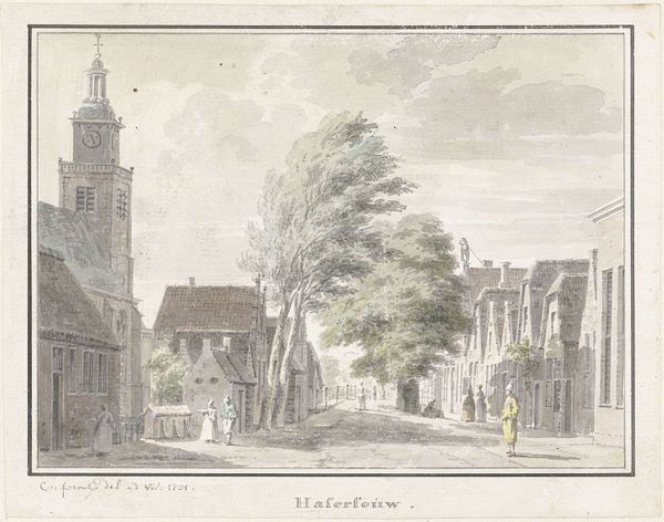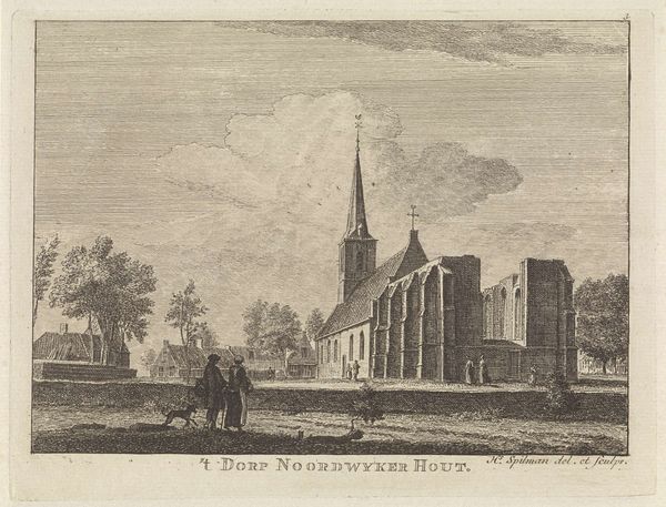 Editor: We’re looking at “Gezicht op Noordwijk-Binnen,” a print by Hendrik Spilman, sometime between 1742 and 1784. It's incredibly detailed. I am immediately drawn to the intricate rendering of the church and the village architecture. The scene feels almost dreamlike, with that hazy sky. What catches your eye? Curator: Oh, isn’t it marvelous? What grabs me is Spilman's playful dance between reality and idealism. See how the lines of the engraving create texture – not just on the buildings, but even in the sky? And yet, there's something about the perspective that feels just a little... off, isn't it? Makes you wonder, doesn't it? Were they drawing exactly what they saw, or what they wished to see? Editor: I hadn't thought about that. So it’s not just a factual depiction? Curator: Never! It’s a performance of a place. A little like staging a play, really. Look how the figures seem carefully placed, the dogs trotting along. Do you think that makes the scene feel staged? It does to me! It's history filtered through someone’s particular lens, someone’s personal feeling. Makes you question what "reality" truly means. Editor: I see what you mean! I initially saw it as just a landscape, but there's a story being told, even if it’s a bit romanticized. Curator: Exactly! It’s an invitation to look beyond the surface, to get lost in the details, to ponder what it was like, or perhaps *felt* like, to live in Noordwijk-Binnen centuries ago. Perhaps Spilman has successfully allowed the past to haunt us, ever so slightly.