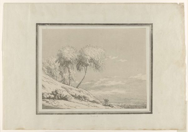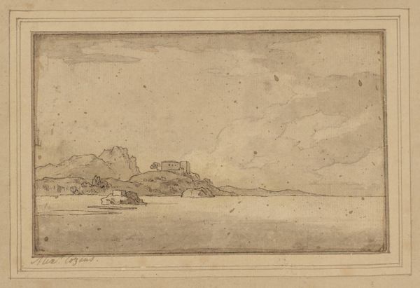 Curator: This subtle wash drawing is titled "Palm" by John Robert Cozens. Editor: I see a quiet melancholy. The soft grays and browns make me think of faded memories, almost like a landscape seen through a gauze. Curator: Cozens, working in the late 18th century, often used watercolors and wash to evoke a sense of sublime tranquility, but also reflected the growing interest in depicting the natural world through the lens of colonialism. Editor: The wispy fronds of the palms look like they're whispering secrets. There's a stillness, but also a hint of something…unsettled? Curator: Perhaps that tension arises from the romanticized view of the landscape versus the socio-political reality of palm trees, often linked to colonial economies and exploitation. Editor: It makes you wonder about the stories untold behind that seemingly peaceful horizon. Art always holds up a mirror, doesn't it? Curator: Indeed. Cozens’s work invites us to consider not just what is depicted, but also what is omitted and how those omissions shape our understanding. Editor: A landscape of layered meanings. It’s a reminder that paradise might have a price.