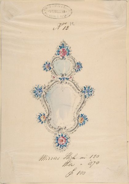 This watercolor drawing of glassware comes from a set of twenty-three sheets produced by the Compagnia di Venezia e Murano. The symmetrical tiered structure of a chandelier is rendered with delicate washes of color. The composition emphasizes a vertical axis, giving it a sense of formality. The drawing's linear quality is striking. The use of line here defines the object's form. The drawing employs transparency, which is an essential feature for representing glass. The added flowers destabilize the clean geometry of the chandelier. These decorations are not just ornamental; they subtly question the boundaries between functional design and artistic expression. Notice how the chandelier's design embraces complexity through its multi-tiered arrangement and the intricate detailing of garlands. It invites us to consider the semiotic interplay between form and decoration and the fluid boundary between the practical and the ornamental. The image challenges fixed meanings, engaging new ways of thinking about space, perception, and representation.