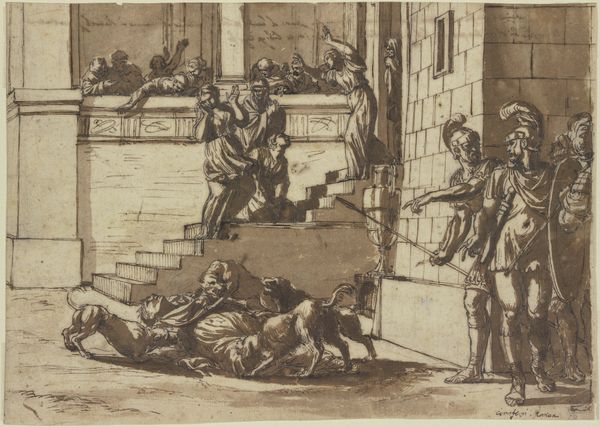 Curator: This print, "La Peste chez les Philistins" or "Plague Among the Philistines," is attributed to Jean Jacques Lagrenée the Younger, dating roughly from 1782 to 1821. The etching and drawing utilizes a sepia tone, quite striking actually. What's your initial take? Editor: My immediate response is… visceral. There's a certain immediacy in its depiction of suffering that’s hard to ignore. The bodies, the gestures, it evokes panic and despair. You almost smell the decay emanating from the print itself. Curator: Precisely! The way Lagrenée used etching to create textures is remarkable. Look at the fabrics clinging to the figures. Note also the use of shadows to sculpt bodies ravaged by disease, lending realism. How do you view its placement in history? Editor: Well, beyond the explicit narrative pulled from religious text, I’m seeing broader socio-political resonance. Think of how plagues and epidemics ravaged communities, prompting reassessments of power, social order, and institutional efficacy. This image speaks volumes about public health anxieties during a pre-modern world without robust scientific solutions. Curator: It also speaks, perhaps indirectly, to Lagrenée's own artistic influences. Academic art heavily emphasizes narrative painting; but this moment of societal collapse allows us also a view into the social fabric of the time it was produced, considering art consumption. It invites debate between art history and craft due to its being an etching. Editor: Yes, the choice of a print is fascinating when considering accessibility. Did this make it affordable and therefore widen access for viewers? Curator: Quite likely. Printmaking as a reproductive medium expanded audiences, though we must also factor in literacy rates. But indeed, the intent to circulate such imagery points toward a broader societal discourse. Editor: And that makes me consider further. Who controlled the means of this print production and its distribution? Was this officially commissioned, or produced independently for subversive means? These questions underscore how this work exists within economic power structures as well. Curator: Questions worth pursuing, definitely. Thanks for these perspectives. They illuminate both the art's subject and the socio-cultural conditions of its making and distribution. Editor: Thanks for the detailed intro to it, allowing this dialogue to emerge. Food for thought all around, right?
