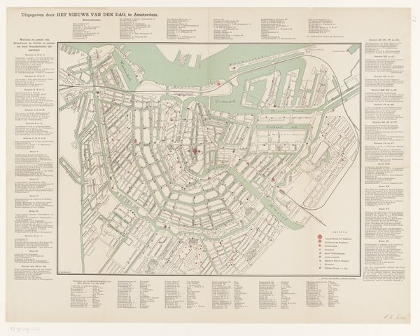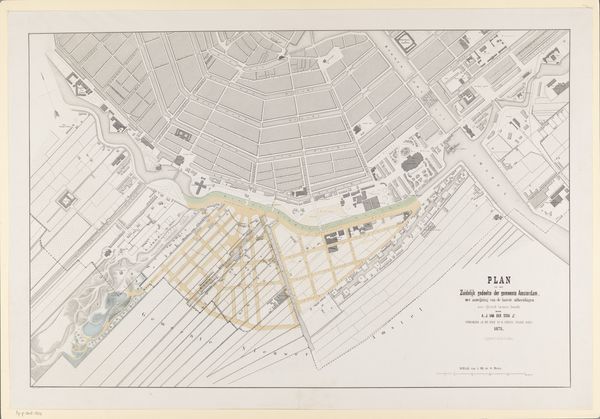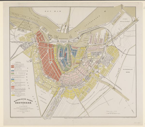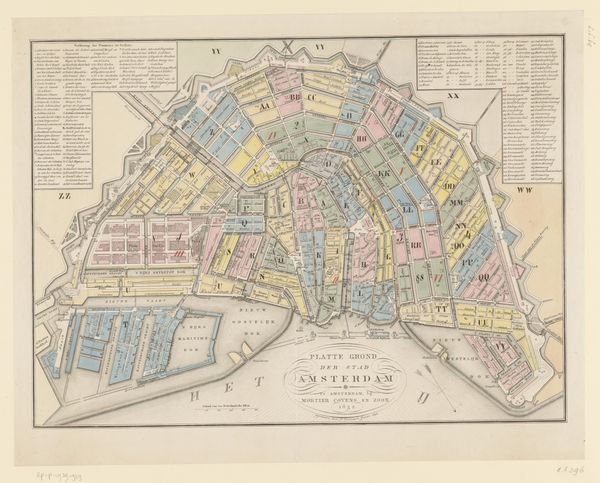 Curator: Today, we are looking at a "Plattegrond van Amsterdam," or a plan of Amsterdam, from 1872 by Albertus Braakensiek. Editor: At first glance, it’s an oddly soothing explosion of color and intricate lines, like looking into a complex clock mechanism, but it’s also quite serene with the blues, yellows, and greens. It really draws you in. Curator: Indeed. The map offers a fascinating window into the spatial and social organization of the city at that time. Amsterdam’s urban development has always been intensely linked to its cultural identity, and that shows in pieces like this. The use of the waterways is incredibly prominent. Editor: Precisely. Those waterways become arteries and, reading this now, it’s tempting to overlay contemporary perspectives on urban planning, questions around accessibility, even equity in resource allocation in different city quadrants reflected by differences in color. Did those disparities map onto something we recognize in identity politics now, I wonder. Curator: What’s so significant about the canals is their function not just as transport routes, but how they determined land use, influenced trade, and subsequently impacted the city's demographics and social strata. Amsterdam’s wealthy merchants, of course, would have shaped so much of this reality. We might interpret color blocks and the buildings as visual reminders of such structures, even biases. Editor: And you’re right. If we can step back to really see this less as simply geography and more a visual embodiment of power structures… That act of representing it, fixing the layout in this printed form, must itself be understood as a profoundly political gesture, creating an approved version of what should endure. Curator: Exactly! It solidifies a certain view of the city that would influence not only policy but public perception. Think about how it would inform everything from land speculation to narratives of progress and identity. Editor: Thank you. Looking closely allows us to challenge what that layout privileges or obscures, prompting important discussions about history, memory, and, perhaps, planning for a more just future. Curator: It's artworks like this which push us to question our surroundings, the values they embody, and how cities continue to be shaped by similar forces today.