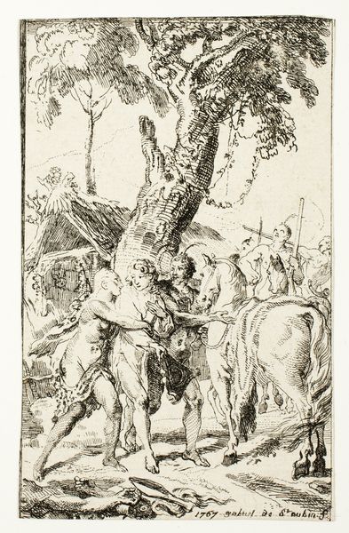 This is "Fuite de M. de Belle-Isle, prisonnier chez les Attakapas," an etching made in 1767 by Gabriel de Saint-Aubin. In this period, prints like this were a crucial way of circulating information and stories across society, and also acted as a tool of political commentary. The image is made up of finely etched lines on a copper plate, which would then be inked and printed onto paper, a process that requires a high degree of skill. Saint-Aubin shows us the escape of Monsieur de Belle-Isle from the Attakapas people. The scene seems to depict a heroic rescue, but the story behind this print involves the messy history of colonialism in North America. The Attakapas were an indigenous group living in present-day Louisiana. From the French perspective, they were regarded as ‘savage’. The print not only tells a story, it also promotes a particular viewpoint and reveals the social biases of its time. It reminds us that prints, like any other medium, can be powerful tools of propaganda, shaping public opinion and justifying the actions of those in power.