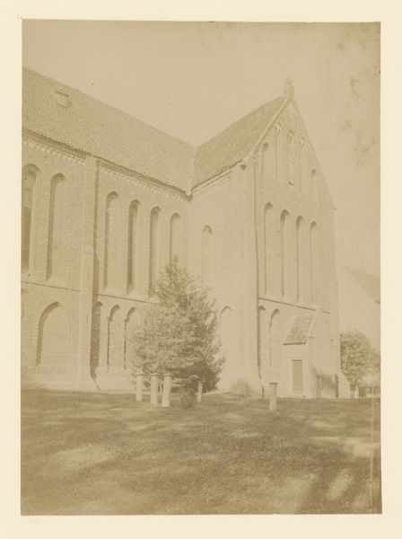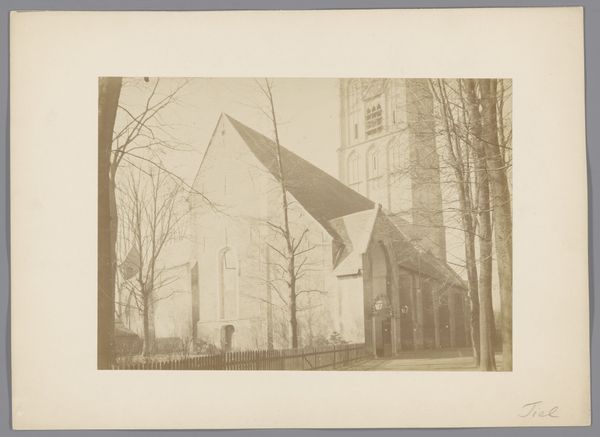 Curator: This compelling gelatin silver print is attributed to William Henry Jackson and is titled "Exterior of a Methodist Church, presumably in Denver." While its precise date is unknown, it's estimated to be from between 1860 and 1900, giving us a glimpse into a pivotal period in American history. Editor: Wow, what strikes me first is this incredible stillness. It’s almost haunting. The bare trees framing the solid stone structure create a sense of profound isolation and makes you wonder what that period of the city was like, and what sort of life surrounded the church. Curator: I find myself thinking about the social function of the church in that era. In the late 19th century, especially during periods of rapid industrialization and urbanization, religious institutions like this served as critical centers for community building, moral guidance, and social support. How did this structure influence the politics of a changing Denver? Editor: Totally. The church's steeple—that arrow aimed at the heavens—it makes you consider concepts like redemption and spiritual solace in the face of societal challenges. What do you make of Jackson's decision to capture it in gelatin silver? I find this process to create the feel of this particular church photograph really ties into that era of pioneering in the West, capturing the vast open spaces as well as these rapidly erected hubs of gathering. Curator: That's a smart observation. The sharp detail afforded by the gelatin silver process, allowed for a clear, almost hyperrealistic, documentation of this Western landscape, of how the architecture embodied notions of progress, civilization, and spiritual aspiration within this expanding frontier. Editor: You know, even now, looking at this image, I still find myself craving context. I wonder, for example, what songs might have filled that church? What kinds of sermons would they hear? It just conjures up an incredible desire to learn more about a specific point of time, but somehow so far in the past that the desire might not be fulfilled. It would make for an interesting immersive exhibit. Curator: I agree. This piece prompts crucial discussions about religious influence, westward expansion, and community formation. Thank you. Editor: Thank you, it certainly makes me appreciate the architecture of our country's past a little bit more, while I am living within this one in our present.