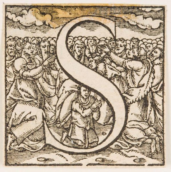 Editor: This woodcut, "Initial S", is by an anonymous artist. I'm struck by its playful yet violent imagery, with cherubs brandishing weapons amidst foliage. What narrative do you think this initial is trying to convey? Curator: It reflects the complex social position of childhood. On one hand, innocence and purity are often projected onto children. Yet, they're also used as symbols of power and even violence. How might the cherubs’ aggression challenge idealized views of childhood? Editor: It's interesting to consider how this seemingly decorative initial hints at darker undertones. Thank you. Curator: It prompts us to consider the cultural narratives we project onto the young and how these relate to broader power structures.