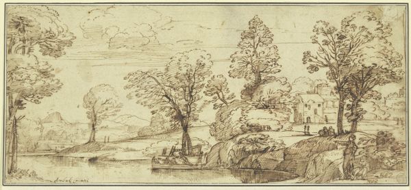 Editor: This is John Skippe's "Landscape with River and Trees." It's a small ink wash drawing. I’m immediately struck by the almost dreamlike quality. It's so serene. What symbols do you see within the drawing? Curator: Notice how the trees, almost like figures, lean towards the river. The river, a classic symbol of time and change, reflects not just the sky, but perhaps a deeper, more enduring truth about nature. How does that visual echo resonate with you? Editor: I guess it feels like nature is both a mirror and a constant. Curator: Precisely! Skippe is using a visual language that connects the earthly and the eternal through easily understandable universal symbols. The trees represent longevity and continuity, as well. Editor: That makes the whole scene feel much more timeless. Thank you for pointing that out!