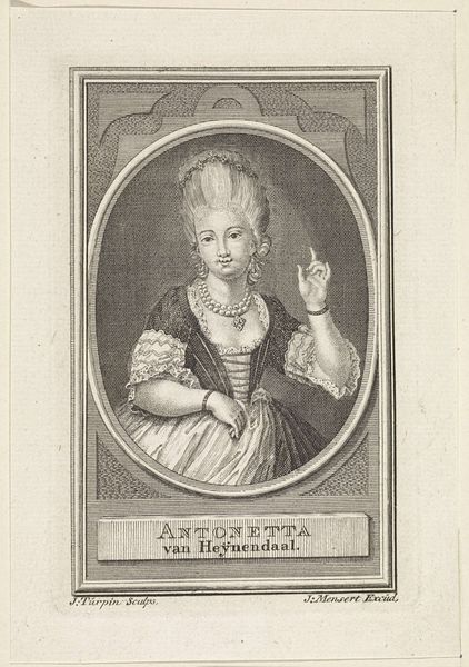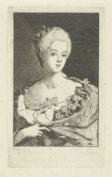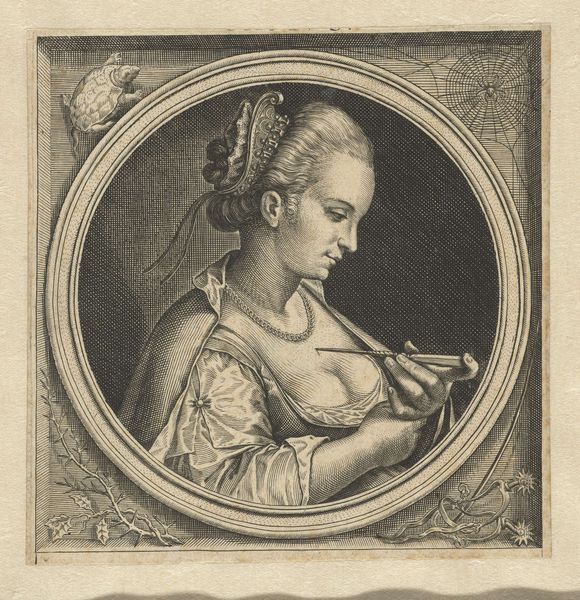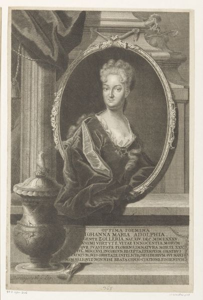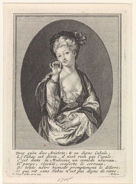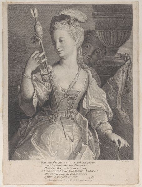 Editor: This engraving, "A Young Woman Holding a Mask," made sometime between 1683 and 1733 by Bernard Picart, depicts a young woman in Baroque-era dress. She holds a mask and has a coy expression. It feels almost like a scene from a play. How do you interpret the symbols within this piece, particularly the mask itself? Curator: The mask is indeed central. Masks, historically, are transformative objects, acting as vehicles to reveal or conceal identity. In this period, a mask at a ball isn't simply for disguise; it’s a sanctioned space for exploring different facets of the self, a flirtation with anonymity and the liberation it offered, particularly for women navigating social constraints. It's a charged symbol, connected to freedom, intrigue, and even deception. Editor: Deception? How so? Curator: Think about what the face is meant to project: honesty, trustworthiness, individuality. The mask hides these. It gives the wearer the potential to play with those projections. Why is the text below in French so intriguing? Is it more of a narrative element or social commentary for you? Editor: I see what you mean. The text does add another layer. I didn't really catch that initially; it seems like a caution against love and venturing away from one's mother's protection, a little bit of cynicism, perhaps? I can't quite decide if that is part of the overall symbolism as a way to create multiple potential meanings from the artwork or a historical artifact that's specific to that period of art production and its target demographic. Curator: Exactly. It speaks to a cultural memory of the dangers lurking beneath the surface of polite society. That contrast between innocence and potential duplicity – captured by the mask and reinforced by the text– gives the image its lasting resonance. The cultural memory of masquerade continues to show up in modern interpretations of costumed figures from super-heroes to clowns, with all those loaded implications. Editor: That's a fantastic way to tie it all together. The mask embodies societal freedoms and hidden dangers that can echo through art throughout the years!
