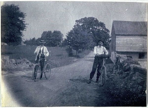 This photograph, "Man standing next to a tandem in Lisieux," was created by Delizy. The image captures a moment of personal mobility and leisure in a specific social context. During the late 19th and early 20th centuries, the bicycle became a symbol of freedom and independence, particularly for women. It challenged traditional gender roles and allowed women greater mobility and autonomy. Here, the man stands proudly next to his tandem bicycle, dressed in a suit and cap, suggesting both his social standing and participation in this new form of recreation. The setting of Lisieux, with its picturesque architecture, enhances the photograph's charm and evokes a sense of timelessness. The tandem bicycle itself speaks to collaboration and partnership, hinting at the social dynamics and relationships of the time. Ultimately, the image invites us to reflect on the intersections of technology, leisure, and social identity. It highlights the ways in which personal experiences are shaped by broader cultural and historical forces, reminding us of the ongoing negotiation between tradition and modernity.