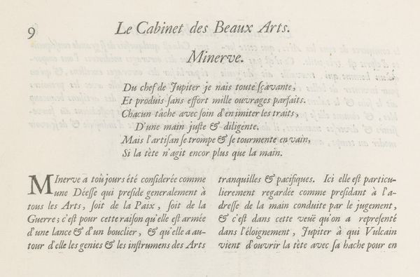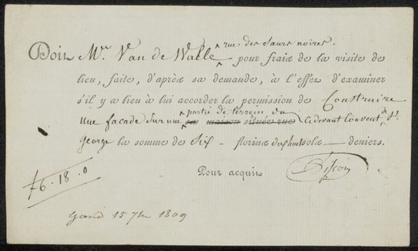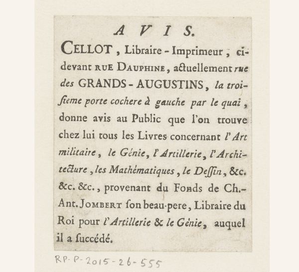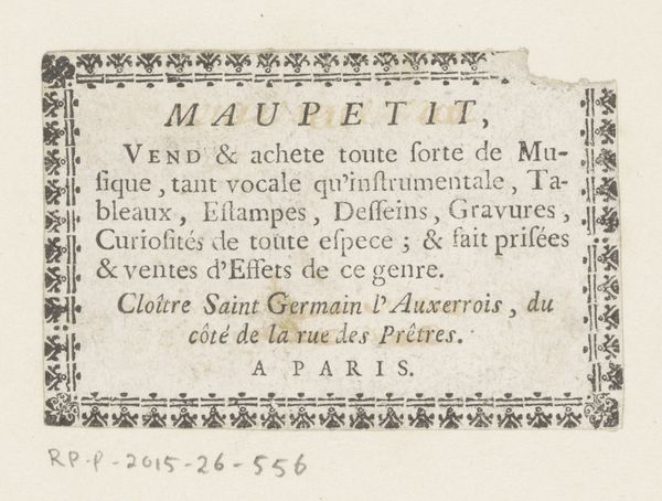 Curator: This piece, potentially from 1817, is a calling card for Labalte fils, a printer and vendor of office supplies in Chartres. It's primarily print on, likely, paper. Editor: My first impression is of constrained elegance. The density of text bordered by that delicate floral design creates a curious visual tension, almost claustrophobic yet refined. Curator: Indeed. Note the typography, the considered arrangement of typefaces within such a small frame. It showcases the printer’s craft and aims, using fonts to structure a visual hierarchy within the advertisement. The stylistic use of fonts signifies class distinctions to target particular clients. Editor: That dense text certainly speaks volumes. Consider the cultural landscape; this isn't just about selling paper and ink. The long list of goods— from fine papers to wax for sealing letters, slates, drawing supplies, to playing cards, decorated boxes and screens suggests a burgeoning culture of correspondence and leisure. It really shows who had access to certain commodities, especially as this business was located in France after the French Revolution and the Napoleonic Era. Curator: Precisely! It’s interesting to analyze it beyond just a commercial document, but how design and typography shape a viewer's reception of a printer's wares, and communicate the Labalte fils brand identity. Even now, it feels complete—unified by consistent visual cues like the kerning of letters, or, more obviously, the symmetric visual impact across the X and Y axes of the composition. Editor: And let’s not forget the "etc. etc." It speaks to the potentially limitless nature of commerce. While also telling us what the company sold, it gives insight into the day to day functions of that business’ clientele and the community around it. It makes you wonder: who held this card, what did they purchase? Curator: I agree; viewing such ephemera enriches the historical tapestry, allowing us insights beyond formal aesthetics. Editor: Absolutely. Studying the piece structurally provides key context for grasping Labalte’s historical significance as more than just a calling card, but as a material representation of French society in the 19th century.