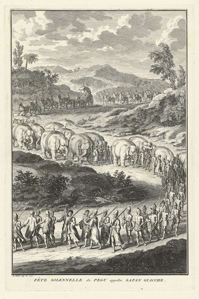 Editor: So, this is Melis Jansz Kock's "Entry of William III into The Hague, 1691," created as an engraving. The sheer number of figures and carriages creates an overwhelming sense of scale. How would you interpret this complex composition? Curator: Initially, one is struck by the stratification, the organization into distinct bands. Observe how the artist utilizes linear perspective to compress space, creating a flattened, almost map-like representation of the event. The procession itself spirals inward, a vortex of movement contained within a highly ordered framework. Notice how the eye is drawn to the foreground, specifically the repeating shapes of horses and figures, which creates rhythm but also emphasizes uniformity. Editor: It's interesting that you focus on the flattening effect. Did this choice of perspective serve a specific purpose? Curator: Precisely! Consider the inherent properties of engraving. Its reliance on line, its capacity for minute detail, lends itself to portraying structured events. This flattening allows for clarity, ensuring that each element within the procession retains a degree of visibility, crucial for communicating power and order. The clear inscription aids understanding but also stands apart visually as a separate plane of visual information, no? Editor: I see. It's not just about representing the event but emphasizing the organization and control behind it. Thank you. Curator: Indeed, by dissecting its visual components, we gain insight into the artist's conscious decisions and what the work sought to represent.