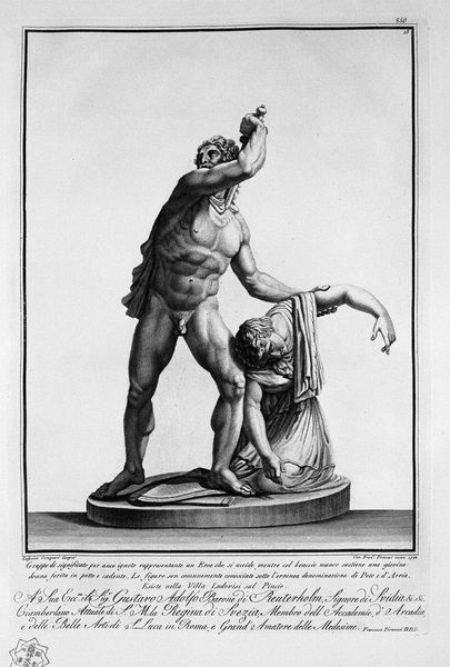 This is Giovanni Battista Piranesi's etching of the "Discus Thrower," capturing the sculpture's dynamic tension through the stark contrast of light and shadow. The form of the athlete, coiled and ready to unleash, dominates the composition. Piranesi employs a strategic use of line and shading to define musculature and convey a sense of potential energy, almost as if the figure could break free from the page. The use of hatching and cross-hatching builds depth. This play with light and shadow is not just descriptive but also deeply expressive. It engages with the very act of viewing. Consider the semiotic implications here; the discus is not simply a sporting object but a signifier of classical ideals of physical perfection and the harmony of form and function. The artwork becomes a site of dialogue between the classical past and the present.
