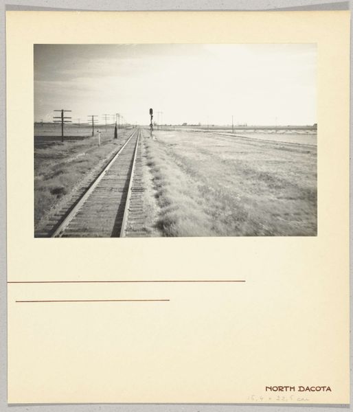 Editor: This photograph, "Untitled (train and sunset)" by Michael Mathers, captured with what looks like silver gelatin print, evokes a sense of starkness and quiet. What symbolic weight do you think the train and sunset imagery carries here? Curator: The train, often a symbol of progress and connection, appears here as a dark silhouette, almost ominous. The sunset, typically associated with endings, also hints at something beyond the horizon, a continuous cycle. Notice the power lines and poles; the birds perched there seem to suggest a moment of pause before a journey. How do these elements play with your sense of time and place? Editor: I see a tension between the industrial and the natural, a fleeting moment captured forever. Curator: Exactly. It's a cultural memory etched in silver, inviting us to reflect on our own journeys and the marks we leave behind.