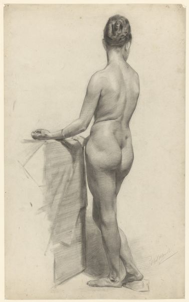 Johann Heinrich Hasselhorst created this drawing of a nude girl in full figure, facing right, in the 19th century. The composition emphasizes the subject’s form through delicate shading against a neutral background. Hasselhorst’s skill is apparent in the way he models the figure's soft contours. He meticulously renders the play of light and shadow across the girl's skin, creating a sense of depth and volume, drawing the viewer’s eye to the smooth transitions of tone which give the figure weight. The artist carefully delineates the shape and volume through subtle changes in shading and the use of hatching which builds up shadow and defines the form. The artwork's formal structure reflects a broader artistic interest in the human form, particularly the nude, as a vehicle for exploring ideals of beauty and naturalism. This approach invites us to reflect on the evolving standards of representation and the ongoing cultural dialogue around the body.