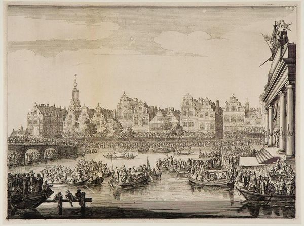 Salomon Savery created this etching in 1638, portraying the 'Steekspel in boten bij het drijvende theater op het Rokin', a tournament on boats at the floating theater on the Rokin. It's a window into the cultural spectacles of the Dutch Golden Age. Savery's image captures a moment of public festivity, reflecting the societal values and entertainment of the time. Yet, the composition also subtly hints at the socio-economic structures underpinning such displays. The elite, marked by their elaborate attire, engage in playful combat, while the masses observe from the riverbanks and boats, their presence essential to the event's significance. Consider how the architecture looms in the background, a solid, classical statement of civic power, contrasting the fluidity of the water and the pageantry unfolding upon it. Savery’s work isn't just a record; it's an invitation to ponder the relationships between performance, power, and spectatorship in a society navigating its burgeoning global influence.