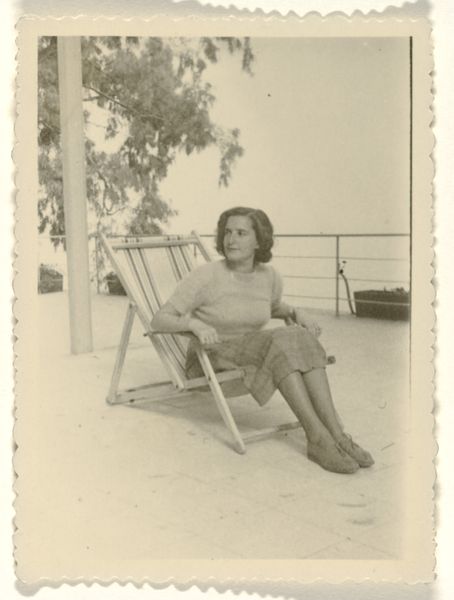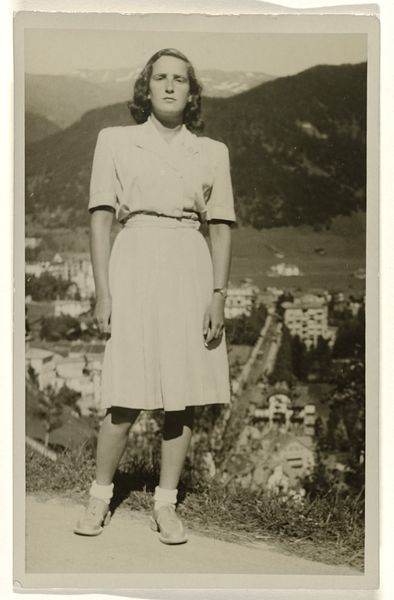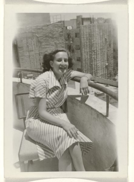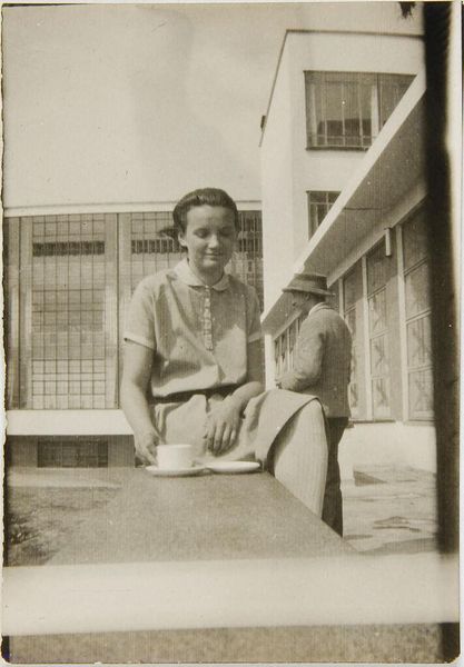 Editor: This photograph captures Gertrud Herold seated on the Bauhaus terrace in Dessau, taken by Leo Baron. It has a calm, almost staged quality. What stands out to you? Curator: It's interesting to consider the Bauhaus not just as a school of design, but as a social experiment. How did everyday life, like a simple coffee break, become intertwined with its public image? Baron's photograph presents a carefully constructed narrative of modern living. What do you think this image was trying to communicate? Editor: Perhaps it was promoting a lifestyle, one that was clean, modern, and connected to the movement’s ideals? Curator: Precisely! The Bauhaus sought to reshape society through its design principles. This image highlights that ambition, blurring the lines between private life and public presentation. It speaks volumes about the power of visual culture. Editor: That’s given me a new perspective on how the Bauhaus presented itself to the world. Thanks! Curator: My pleasure. It's a good reminder that art is rarely just about aesthetics, but also about the messages it conveys.