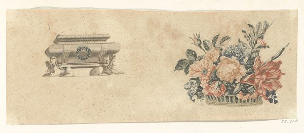 Editor: Here we have "Prentbriefkaart aan Willem Bogtman," a print, likely from 1938, by Richard Nicolaüs Roland Holst. It seems to be made using ink and other drawing materials, depicting a vase of flowers. I’m struck by the color palette. It’s quite muted, yet the composition is so vibrant. What do you see in this piece? Curator: My gaze is immediately drawn to the interplay between line and form. Holst’s use of contour lines defines the shape of the vase and each individual bloom. Note the subtle gradations achieved through the density and directionality of these lines. What is the effect of contrasting the crisp, precise lines outlining the flowers with the more loosely rendered lines that make up the vase itself? Editor: I see what you mean. It creates a sort of visual tension, making the flowers appear more defined and alive, while the vase seems almost ephemeral. Curator: Precisely. The relationship between the representational and the abstract is what engages me. He presents a recognizable still life, yet the mark-making itself is foregrounded, reminding us of the constructed nature of the image. Consider, too, the placement of the floral arrangement—how it interacts with the edges of the frame, creating a sense of contained energy. Editor: That makes me look at it differently, because the vase is clearly set back but the flowers break free and almost tumble forward. I initially saw a simple flower print, but the tension makes it very interesting. Curator: Indeed. By examining these formal elements, we can begin to unpack the deeper layers of meaning embedded within this seemingly straightforward composition. I wonder if there are echoes here of Symbolist aesthetics and ideas? Editor: It’s amazing how much can be gleaned just by looking closely at the lines and forms! I learned so much about interpreting art from our dialogue.