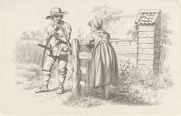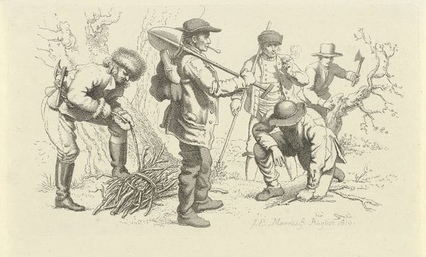 Editor: This is an engraving by Martinus Rørbye, titled "Illustration til 'Halvhundrede Fabler for Børn' af Hey", dating from 1834. It reminds me of a childhood scene. What immediately strikes me is how the detailed line work captures such a playful yet slightly unnerving moment. What do you make of the narrative in this work? Curator: Oh, this one's a charmer, isn’t it? A shiver of something almost ghostly wrapped in the naive innocence of childhood. The line work gives it that feeling, like a faded memory. The engraving teases at a fable; that snowman, almost anthropomorphic with his pipe, stands guard. It reminds me of Punch, that rascal of English folklore! I think it plays on that liminal space between the real and the imagined that is particular to a child’s mind. How do you read the body language of those kids, looking at this snow guardian? Editor: They look like they're planning something sneaky, maybe about to run away? There's definitely some apprehension there too. Do you think Rørbye meant to evoke that tension between childhood mischief and the unknown? Curator: Precisely! Rørbye had such a lovely knack for capturing those fleeting, almost ungraspable emotions. And you have to wonder about that specific cultural moment – a time steeped in fairy tales and moral instruction. Is the snowman there to frighten, to warn, or is he a comrade in their fanciful adventures? He's like the silent, smoking custodian of childhood secrets. Editor: I see it now! It's less a straightforward story and more a snapshot of a child’s rich imaginative life, colored with a touch of apprehension. Thanks for illuminating the different levels at which we can engage with this work. Curator: My pleasure. That little frisson of mystery is what makes it so bewitching, don’t you think? It invites us to rummage through our own childhood closets!