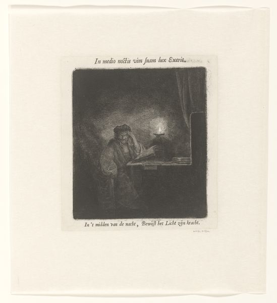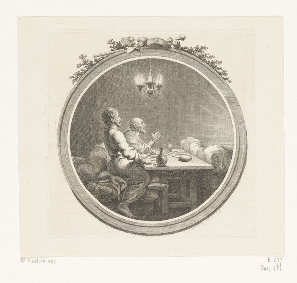 Curator: So, here we have Charles Jacque's "Three Figures at a Table with a Portrait of a Woman Below", made in 1844. It seems to be a print, probably an etching. Editor: It's fascinating how much detail he gets with what looks like minimal lines. The lower portrait feels very separate from the scene above, almost like an afterthought. What's your read on it? Curator: For me, it immediately raises questions about the production process. The etching technique itself—how does that impact the kinds of images he could create, the distribution, the cost? The contrast between the gritty scene of labor above and the detached portrait hints at social divisions. Were these prints aimed at a specific class? What sort of labor would this have entailed for Jacque? Editor: That's an interesting perspective. I was more focused on the narrative hinted at in the scene. But thinking about the labor involved does change things. Curator: Exactly! Think about the materials too: the paper, the ink, the tools. How readily available would they be, and who controlled their access? Were the figures at the table part of a burgeoning working class depicted through a specific print-making practice? The relationship of his chosen materials impacts the kind of labor performed and how this social hierarchy is manifested and perpetuated, right? Editor: So, by analyzing the materials and method, you’re essentially tracing the economic and social landscape of its creation? Curator: Precisely! The etching becomes a record of the artist's labor and a reflection of the wider economic and social forces at play. The placement of the figures at the table hints at an underlying current and shared meal, and through his art, it immortalizes their actions. Editor: I never considered that before. Looking at it this way opens up a whole new understanding of art’s place in history. Curator: Indeed, shifting the focus from simply what is represented, to how it was made and the context of production, helps us reveal so much more.