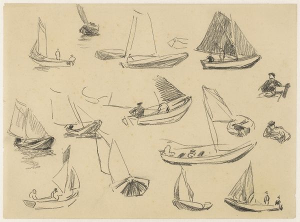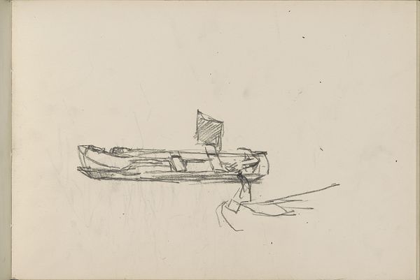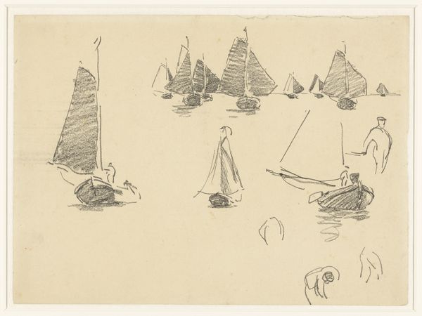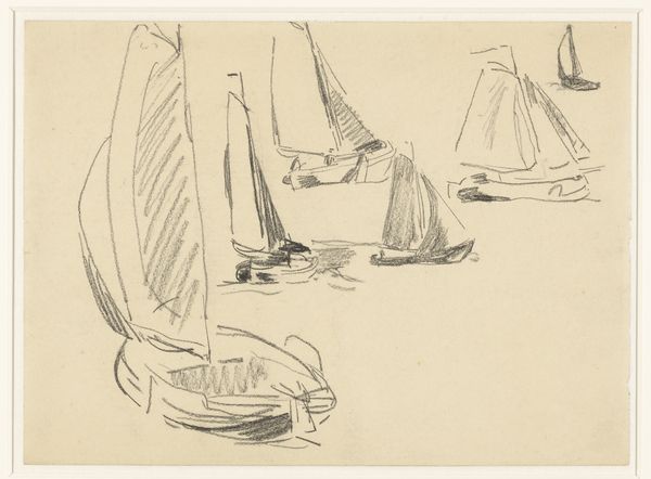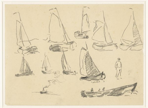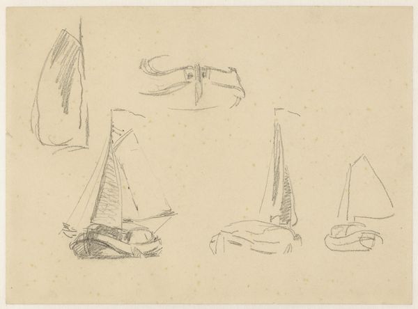Curator: Johan Barthold Jongkind created this piece, entitled "Two Sailboats on Calm Water," sometime in the mid- to late 19th century. Editor: There's a real stillness to this sketch, even with the boats present. It’s a very simplified scene but manages to evoke a calm, airy feeling through minimal means. Curator: Indeed. Jongkind, as a predecessor to the Impressionists, often focused on capturing fleeting moments of light and atmosphere. You can see that in the quick, economical lines he uses here to suggest the sails and reflections on the water. The materiality of pencil on paper, and the efficiency of its execution, point to a work created en plein air to capture the scene rapidly. Editor: The composition directs the eye from the sailboat closer to us to the distant shore—almost like a haiku, where every mark has to count. How do you think the context of 19th-century maritime life informed Jongkind's vision? Was it simply about recreation or was there an economic element here? Curator: That’s a good point to consider. Maritime scenes were indeed popular, reflecting both a fascination with travel and the economic realities of trade and fishing. In Jongkind’s case, his access to harbors along the French coast positioned him as an observer of labor and leisure connected to the water. His choice to use a readily available medium such as pencil aligns this sketch more to documenting working conditions than a statement piece of high art, at least materially speaking. Editor: And formally speaking? The open composition—so much untouched space—lends a certain weightlessness, almost spiritual quality. What do you make of the artistic license Jongkind takes here? Curator: I agree. The artistic "license" comes into play as it elevates everyday life through atmospheric conditions. Jongkind wasn’t just representing ships, but a poetic intersection of light, labor, and leisure on water. That pencil has quite a story to tell. Editor: Ultimately, Jongkind makes us think about impermanence – the fleeting nature of light and atmosphere. Curator: Indeed. And consider, too, the conditions in which such sketches would be made, revealing how a simple pencil on paper is enough to render a particular time and place.