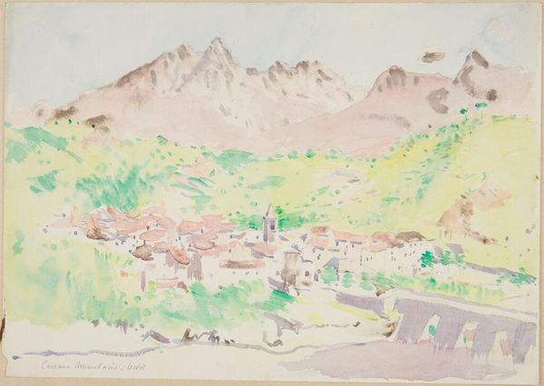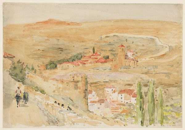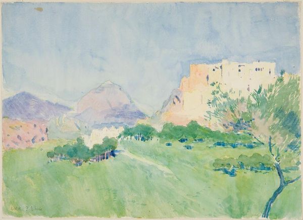 Editor: This is "Landscape near Assouan, Egypt" by Denman Waldo Ross. It's a watercolor piece at the Harvard Art Museums. The colors are so muted; it almost feels like a faded memory. What formal elements stand out to you? Curator: Note the calculated distribution of pigment. Ross's adept handling of watercolor is evident in his use of transparent washes to create depth. Observe how the horizontal composition, defined by layers of color, is interrupted by vertical accents, providing structural tension. Editor: So, it's the considered arrangement, more than the subject, that's key here? Curator: Precisely. The subject is secondary to the formal relationships at play. The artwork's effectiveness resides in its internal visual architecture, its composition. Editor: I see it now. It's like the landscape is a stage for the colors to interact. Thanks for pointing that out. Curator: Indeed, a visual discourse between form and hue.