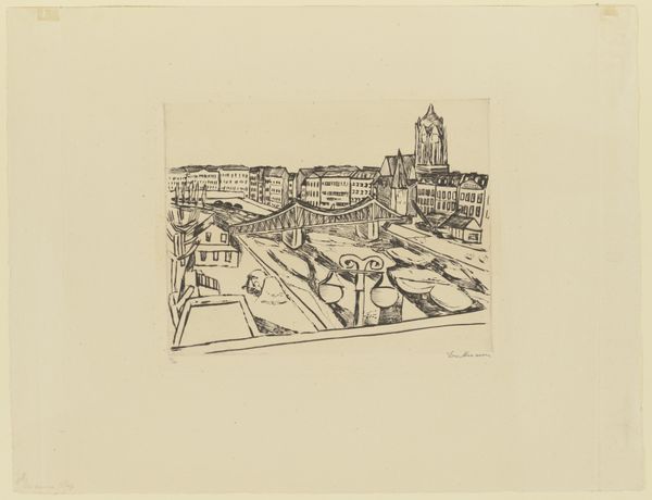 Johannes Löhr made this etching, "View of Amsterdam with houses under construction," probably in the early 20th century. It’s all about the line, isn’t it? Loose, scratchy, and full of energy. It's like he's sketching the city's bones, not just its pretty face. Look at how Löhr uses the etching needle to create different textures. In the foreground, those vertical lines suggest pilings in the water, but they’re also just lines, dancing together. It’s not super detailed or realistic; rather, it seems he's trying to capture a fleeting feeling. I love that looseness, that willingness to let the medium do its thing. The overall impression reminds me of James Ensor, another artist who wasn’t afraid to embrace a kind of raw, almost frantic energy in his work. And like Ensor, Löhr shows us that art doesn’t always have to be polished to be powerful; sometimes, it’s the rough edges that make it real.