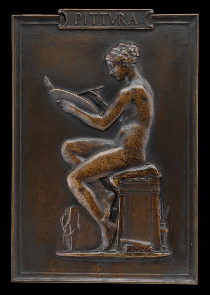 Alexandre-Louis-Marie Charpentier created this enlargement of a plaquette-medal for the Societé des Amis des Livres. The monochromatic bronze relief presents a seated woman in profile, deeply absorbed in a book. Observe how Charpentier models light and shadow to create depth. The texture of the metal surface enhances the contrast, giving shape to the woman’s form and the smooth pages of the book. Her focused gaze and the curve of her arm holding the book emphasize a moment of contemplation. The composition, with its simple geometric lines and restrained detail, functions to keep the viewer focused on the act of reading itself. The relief's structure can be interpreted as a semiotic system, with the book acting as a signifier for knowledge and reflection. Charpentier’s formal choices invite us to consider the artwork as more than a mere depiction but as a symbolic representation of intellectual engagement. The piece embodies a deeper cultural value placed on literature and learning.