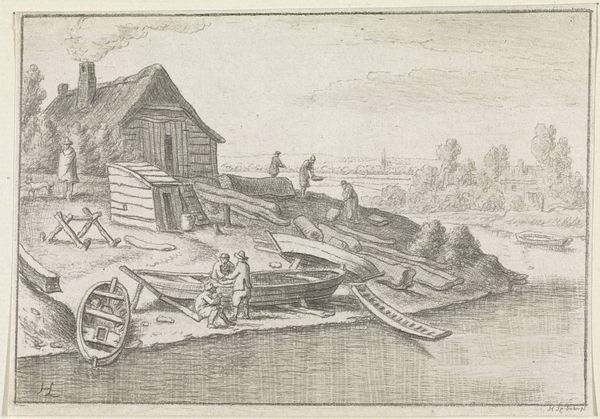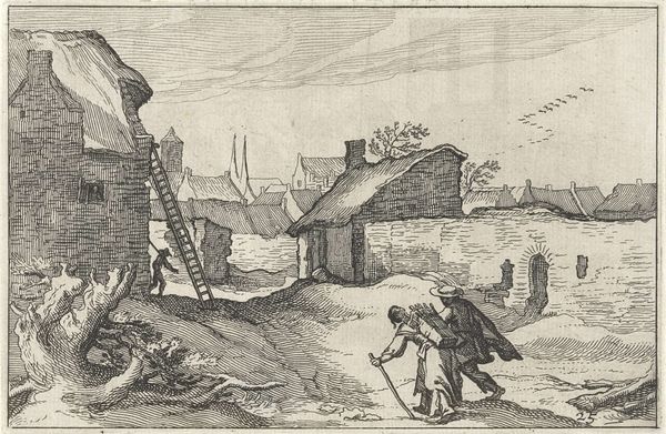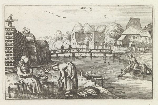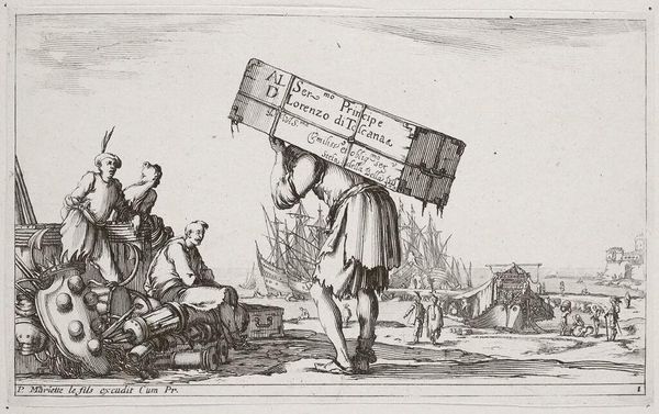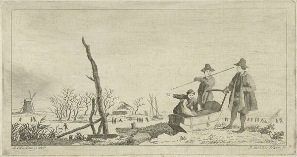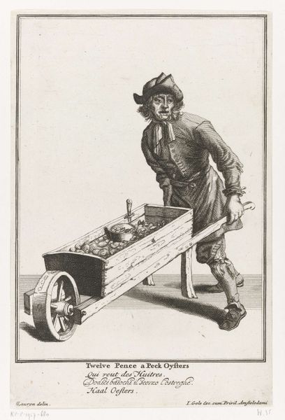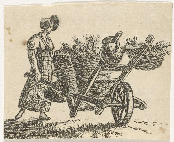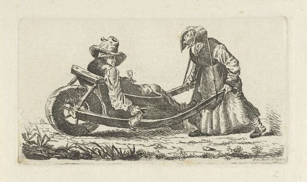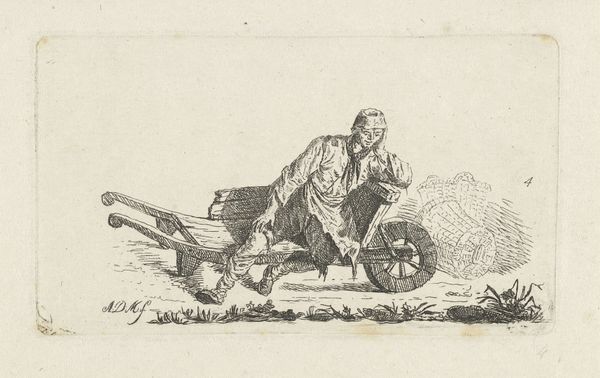 This etching, made by Dirk Eversen Lons in the 17th century, is titled "Woman in Work Clothes, with Wheelbarrow." It reflects the economic realities of the Dutch Golden Age, when the labor of women, often overlooked, was essential to the functioning of society. Here we see a woman performing physically demanding work, pushing a wheelbarrow full of goods. The image challenges the conventional representations of women during this period, who were typically portrayed in domestic settings, engaged in more traditionally feminine activities. In contrast, this woman is shown participating in the labor force, contributing to the economic vitality of the community. What does it mean to see her there? It raises questions about the social expectations placed on women, particularly those of lower socioeconomic status, and offers a glimpse into the diverse experiences of women beyond the domestic sphere.