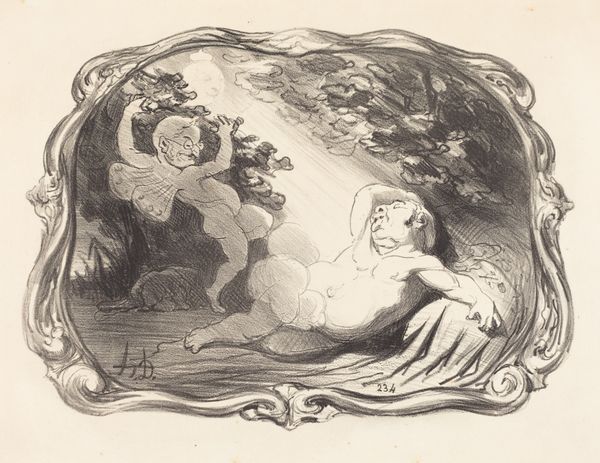 Editor: Honore Daumier's lithograph, "Le Nid abandonné," created in 1851, depicts figures clustered in a nest-like structure, framed elaborately. It’s a bit unsettling. The figures have grotesque features, yet the style hints at Romanticism. What’s your interpretation? Curator: I see this piece deeply rooted in the socio-political climate of 19th century France, especially the post-revolution disillusionment. Daumier often used caricature to critique the bourgeoisie and the political elite. Do you notice how the "abandoned nest" becomes a metaphor? Editor: You mean for a society perhaps? Curator: Precisely. Consider the institution of family, idealized in art but often rife with struggle, abandonment, and societal pressures. The exaggerated features – the bulging eyes, gaping mouths – strip away any sense of sentimental idealism. They represent the harsh realities people faced. Think about the role of print media at the time – how did it shape public opinion and challenge established norms? Editor: So, Daumier uses caricature not just for humor, but as a social commentary weapon? Curator: Absolutely. Lithography allowed for wider dissemination of these critiques. It democratized art and gave voice to dissent, which put pressure on those in power, even indirectly by simply offering this unsettling artwork into the field of aesthetic discourse. Editor: That makes so much sense. I hadn’t thought about the impact of printmaking itself. Curator: Considering the public role of art clarifies so much! I see now that "Le Nid abandonné" is much more than just a caricature; it's a poignant social commentary, amplified by the medium it was created in. Editor: It’s fascinating to understand the layers of meaning embedded within the work through its historical context. Thank you for illuminating it for me!