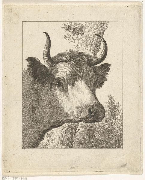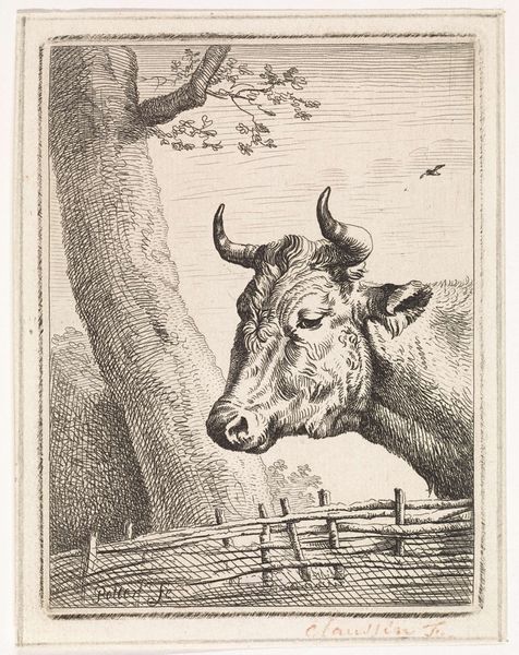 Aert Schouman created this etching of a cow near a fence in the 18th century. Schouman lived during the Enlightenment, a period that valued reason, individualism, and skepticism. This etching, with its detailed focus on the natural world, reflects the growing interest in empirical observation during this era. The cow, depicted with a certain dignity, stands against the backdrop of a rustic fence and tree, suggesting a harmonious relationship between humanity and nature. Consider how seemingly simple scenes like this played a role in shaping Dutch identity. During this time, the Netherlands was a major economic power, yet artists often turned to pastoral subjects, evoking a sense of national pride rooted in the land and its agricultural traditions. This image, while bucolic, invites us to reflect on the complex interplay between nature, culture, and national identity.